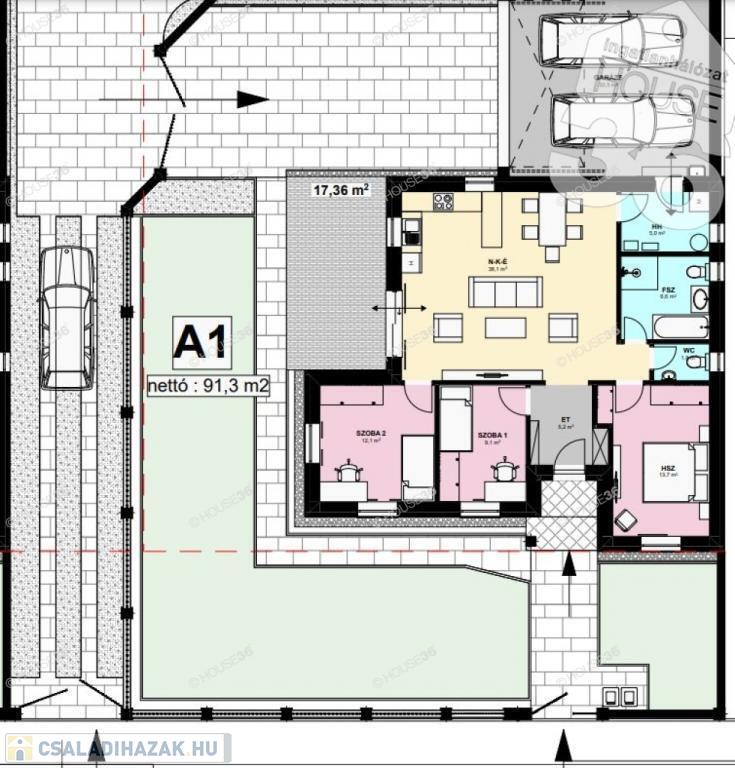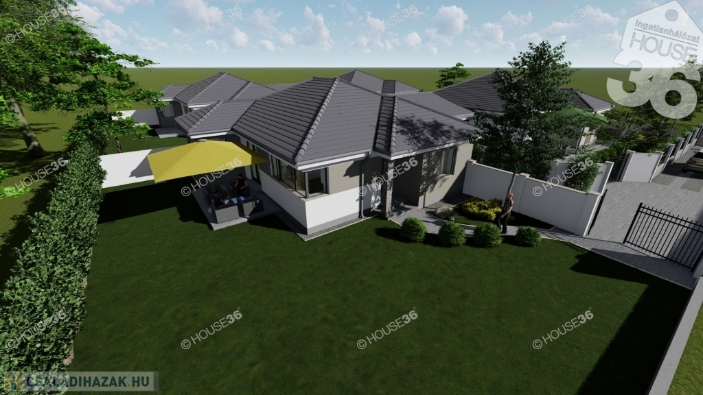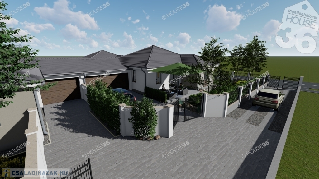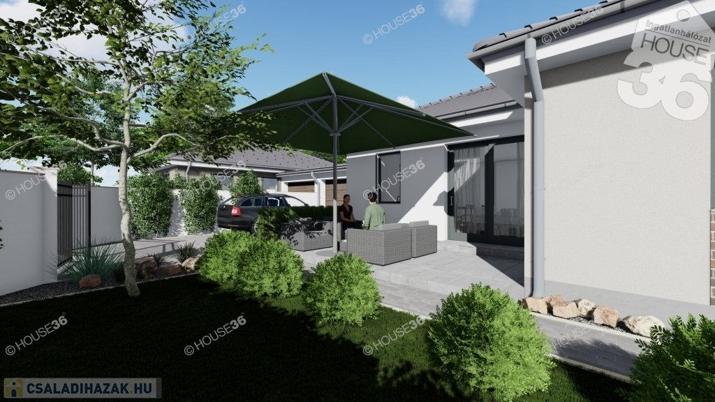 Az összközműves, betonos utcában található 520 m2-es telekre egy 91 m2-es prémium minőségű 1 szintes házat terveztek.
