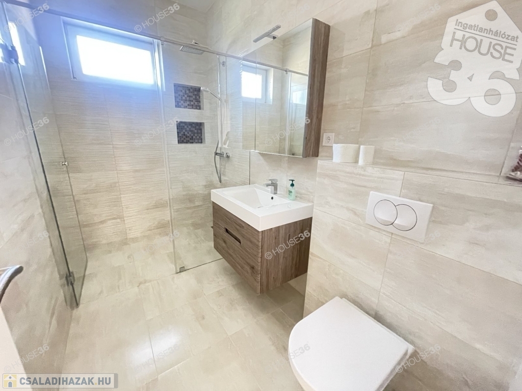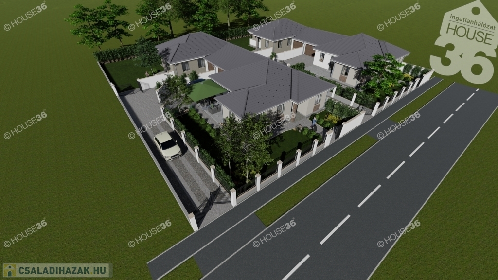 Nappali + 3 szoba, fürdő, külön wc, 18 m2-es fedett carport.