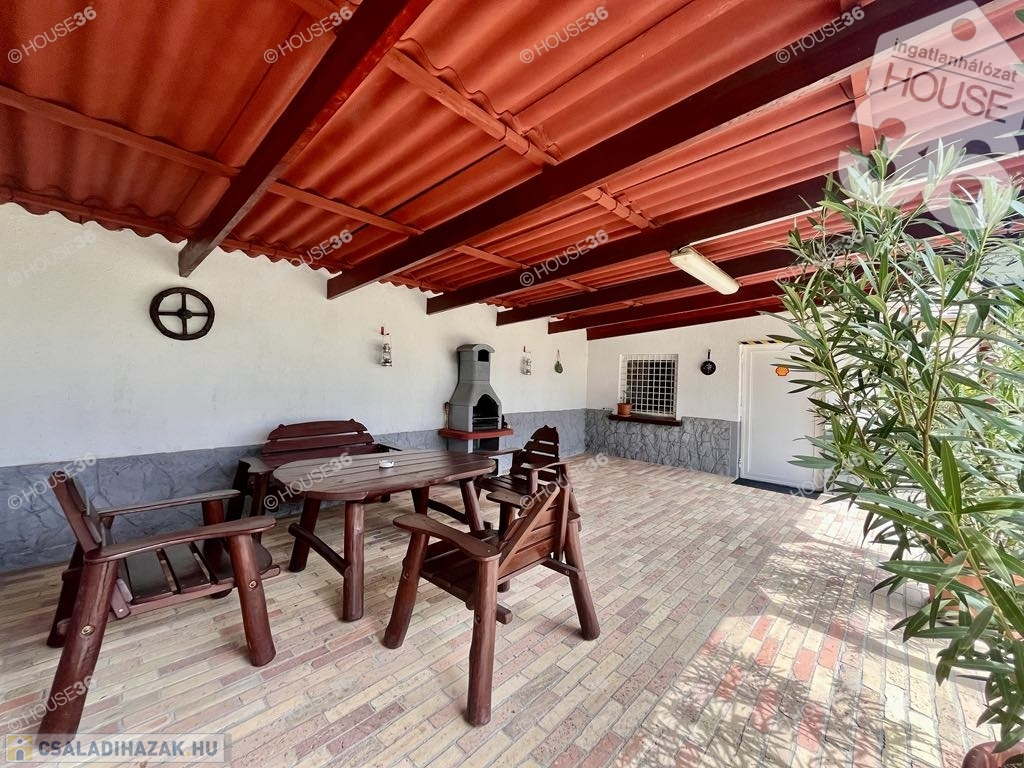 Garázs mellett egykb 40m2-es grillterasz, kis kemencével - villany világítással - és egy kamra.