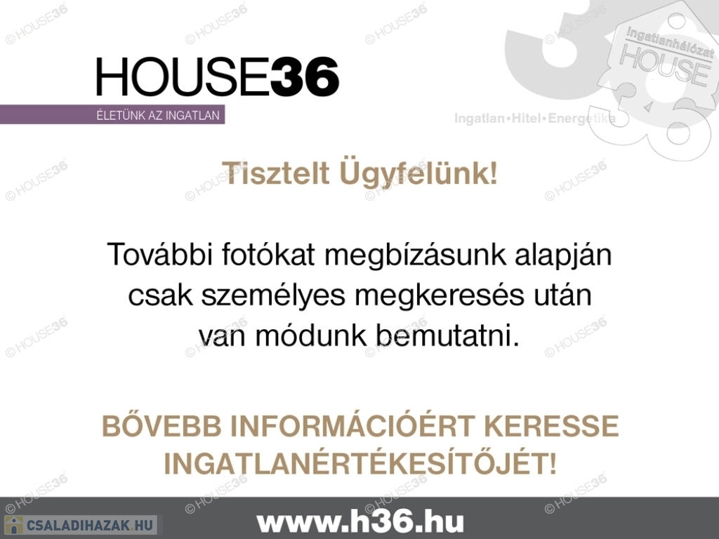 Figyelem! Az adatlap megbízónktól kapott adatok alapján készült, pontosságáért felelősséget nem tudunk vállalni! A tulajdonos kérésére az ingatlan bemutatása egy személyes konzultáció után történik, ahol részletes tájékoztatást kaphat az ingatlan paramétereiről és egyéb kényelmi szolgáltatásairól. A HOUSE36 kínálatában található összes ingatlannal kapcsolatban tudok felvilágosítást nyújtani! Szolgáltatásaink kereső ügyfeleink számára ingyenesek! Az ingatlan kizárólag értékesítő által tekinthető meg! A négyzetméter adatok tájékoztató jellegűek.