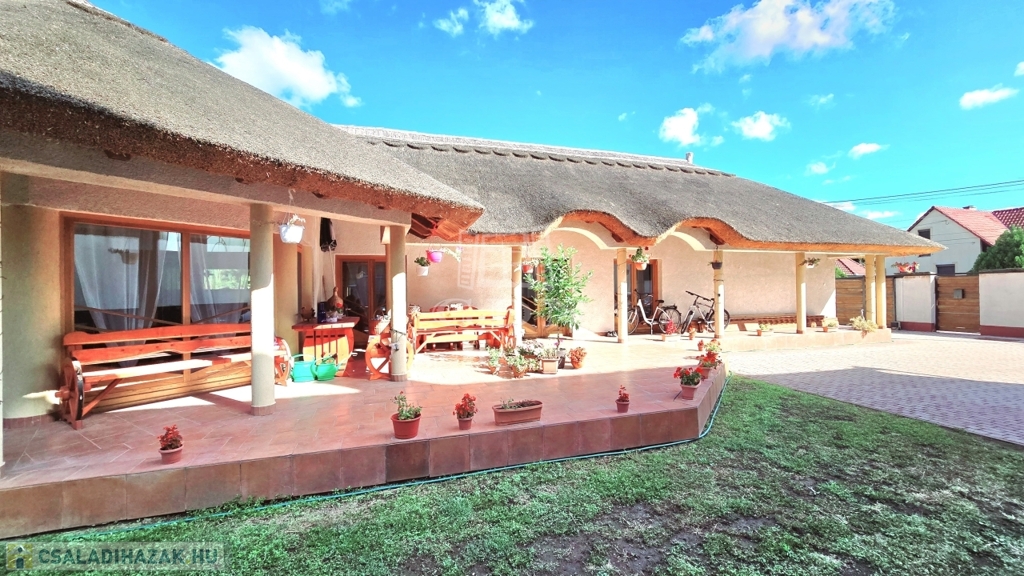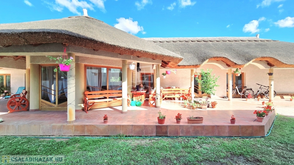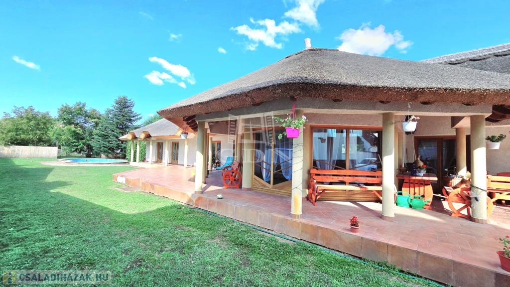 Kecskemét-Hetényegyháza kedvelt családi övezetében eladó egy 1993 szeptemberében elkészült, hagyományos anyagokkal, Prémium minőségben épült nádfedeles villa.