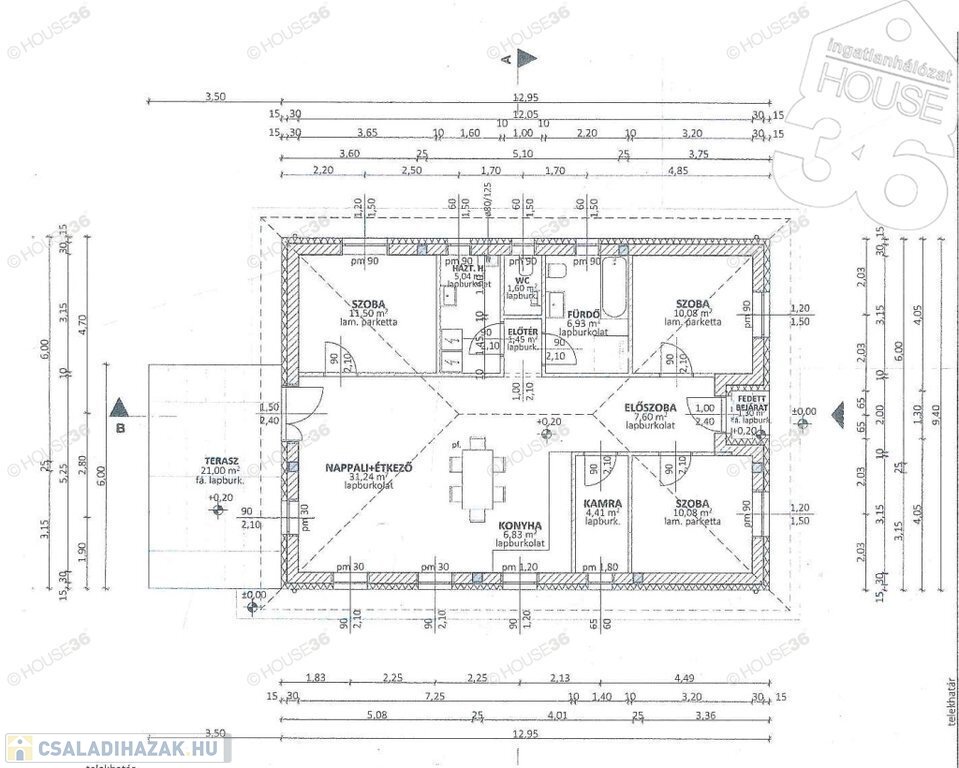 - Helyiségek: Nappali-étkező-konyha + 3 szoba, kamra, fürdőszoba, külön mosdó, háztartási helyiség