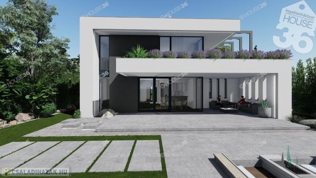 Az összközműves, betonos utcában található 910 m2-es telekre egy 126 m2-es prémium minőségű 2 szintes házat terveztek.
