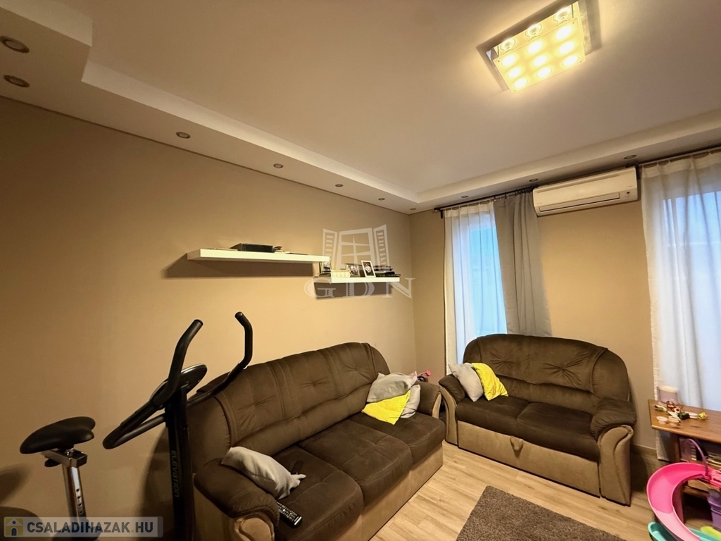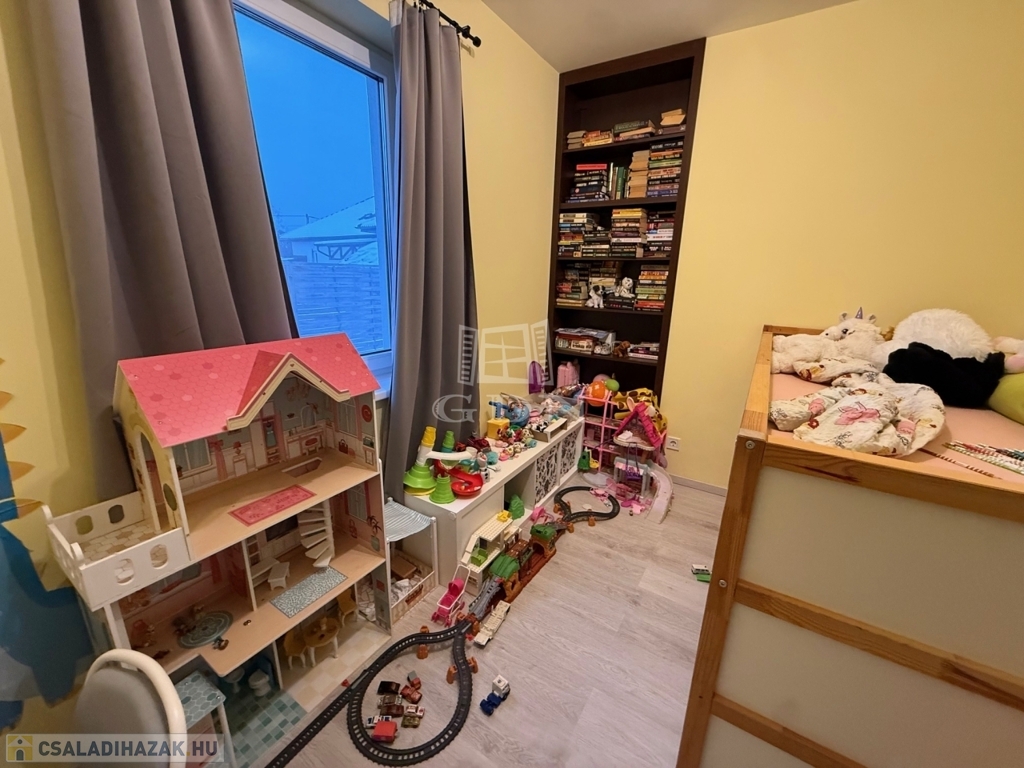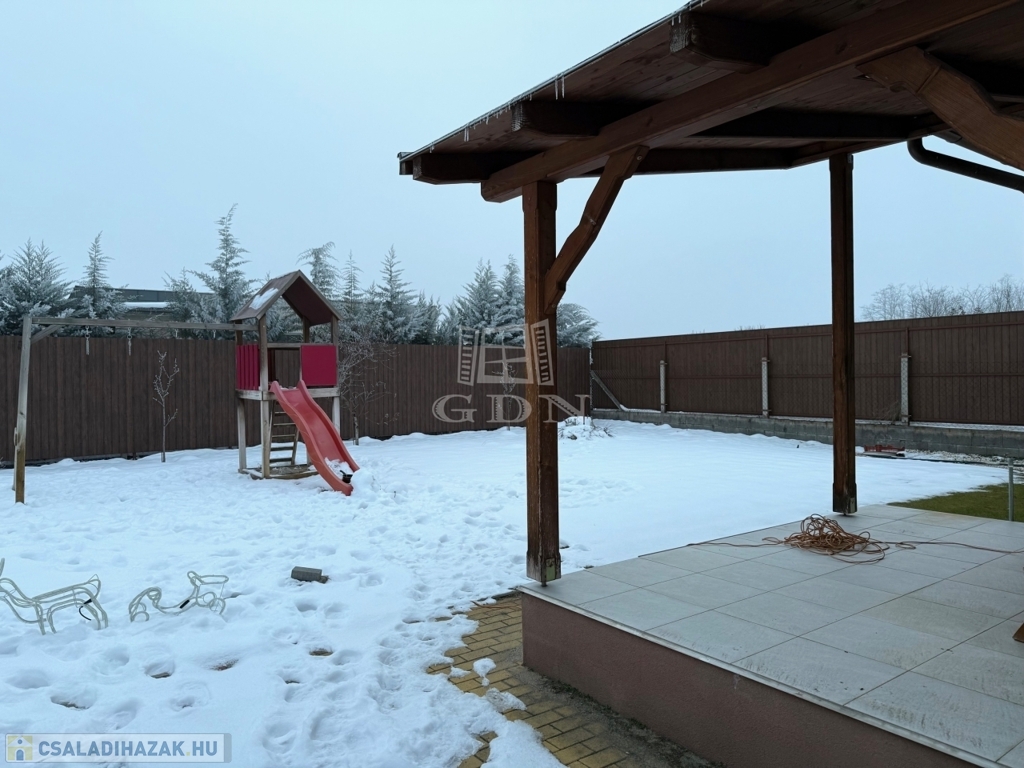 A kert újonnan füvesített, öntözőberendezéssel ellátott, mely fúrt kútról is üzemeltethető. A telken található még fedett gépkocsibeálló, kerti tároló, kis gyermekjátszótér. Az ingatlan tehermentes, 2-3 hónap múlva birtokbavehető.