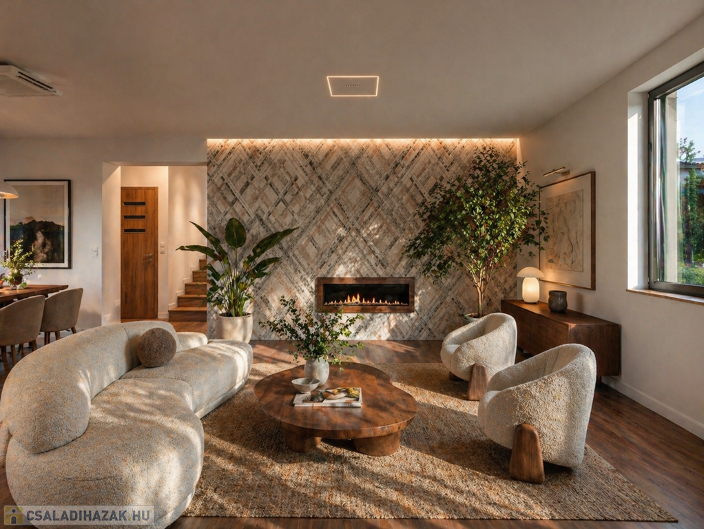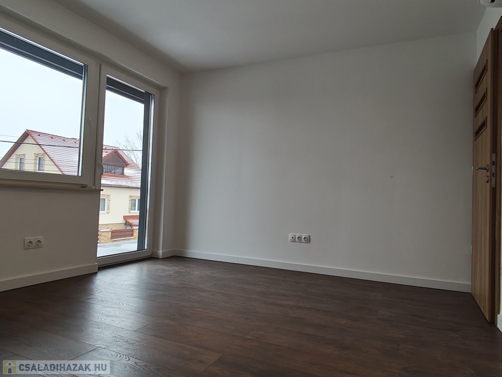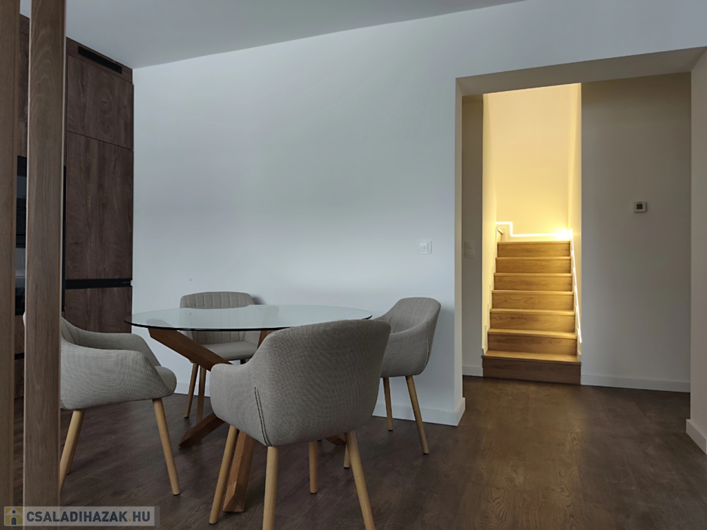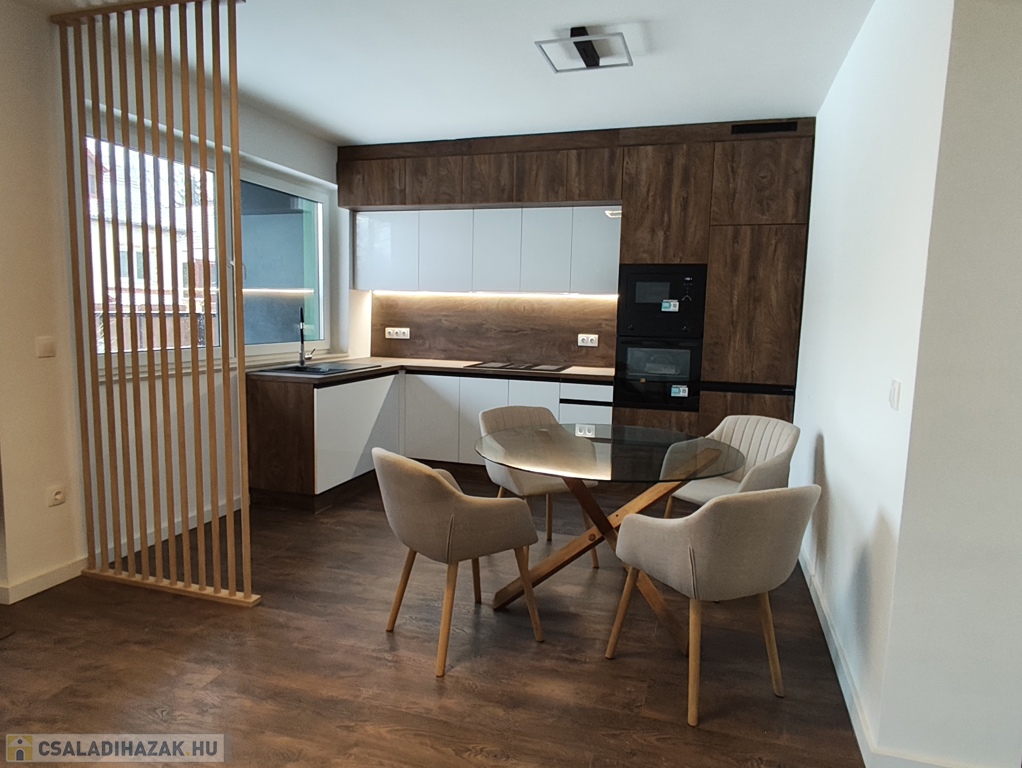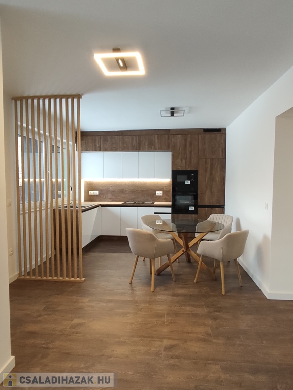 A földszinten található amerikai konyhás nappali, egy hálószoba, gardrób helység, zuhanyzós fürdőszoba két mosdóval, külön wc. A konyhában modern konyhabútor beépített hűtőszekrény, sütő, mikró, mosogatógép, főzőlap szag elszívóval. 13nm terasz.