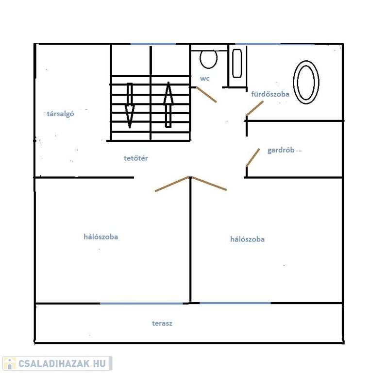 Tetőtérben található egy társalgó rész, két nagyméretű 15nm szoba, egy gardrób helység, kádas fürdőszoba, külön wc. 14nm terasz