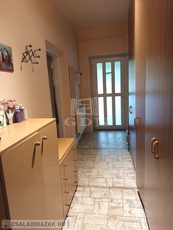A 10 nm nagyságú fedett teraszon át haladunk az előszobába, ahonnan nyílik a konyha, a fürdőszoba, és a 3 szoba.