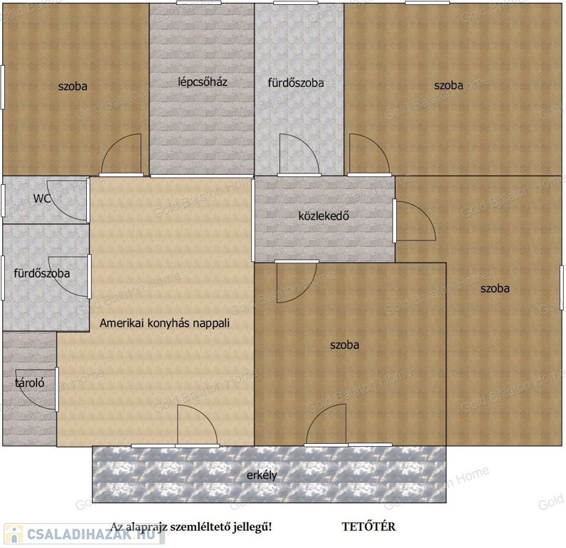 - Tetőtéri helyiségek: amerikai konyhás nappali, négy szoba, kettő fürdőszoba, külön WC, közlekedő, tároló, erkély.