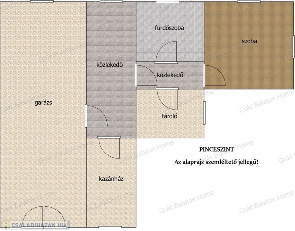 - Pinceszint helyiségei: szoba, fürdőszoba, közlekedő, tároló, kazánház, garázs.