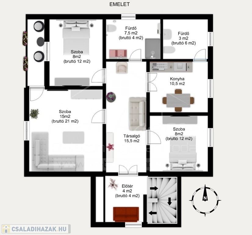 Emelet: 91 m² bruttó (kb. 75 m² nettó) + 4 m² terasz.