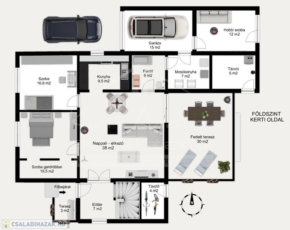 Földszint: 112 m² lakótér + 15 m² garázs + 34 m² terasz (hátsó fedett) + 9 m² kazánház és tároló.