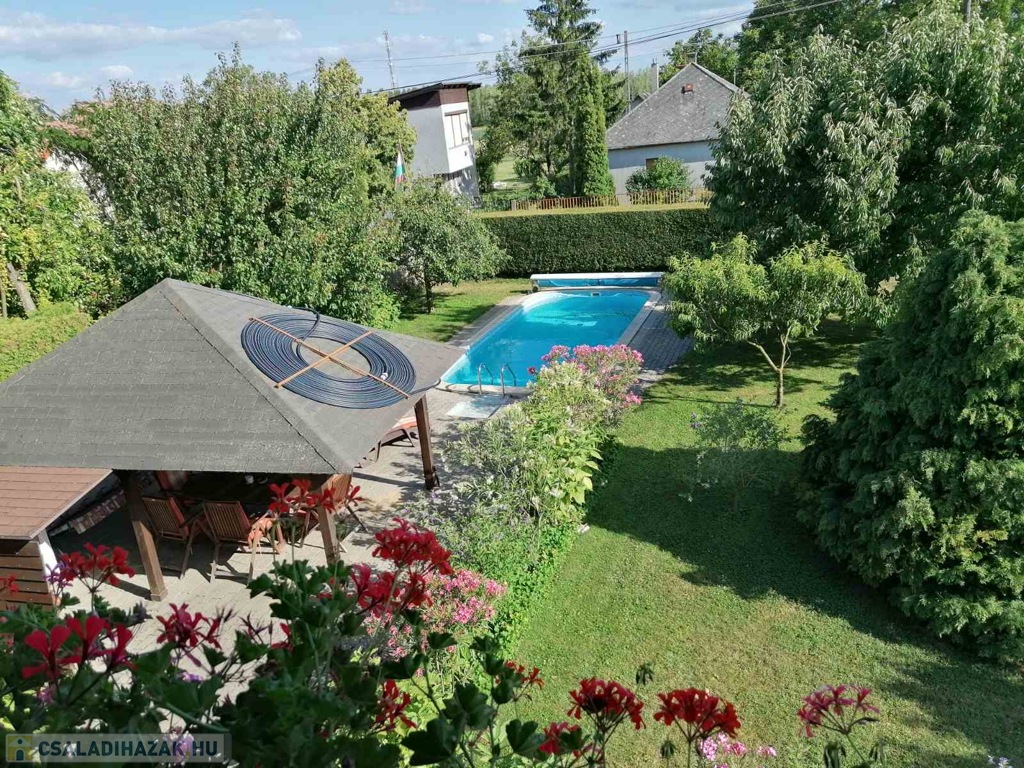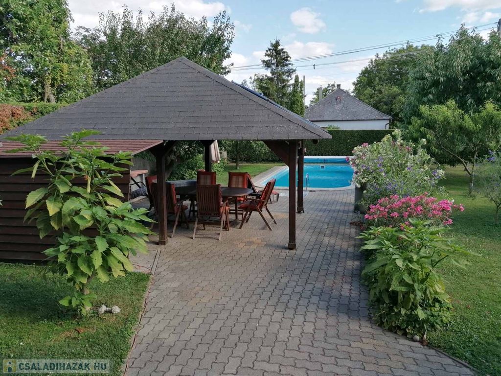 • Telek: 1000 m², gondozott udvar, grillező fedett pavilonnal, 7,5 m x 3,5 m-es medencével (gépészeti aknával).
