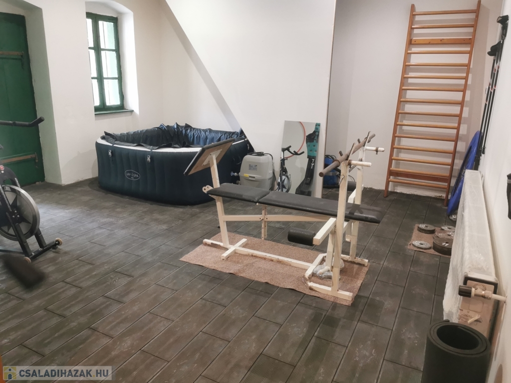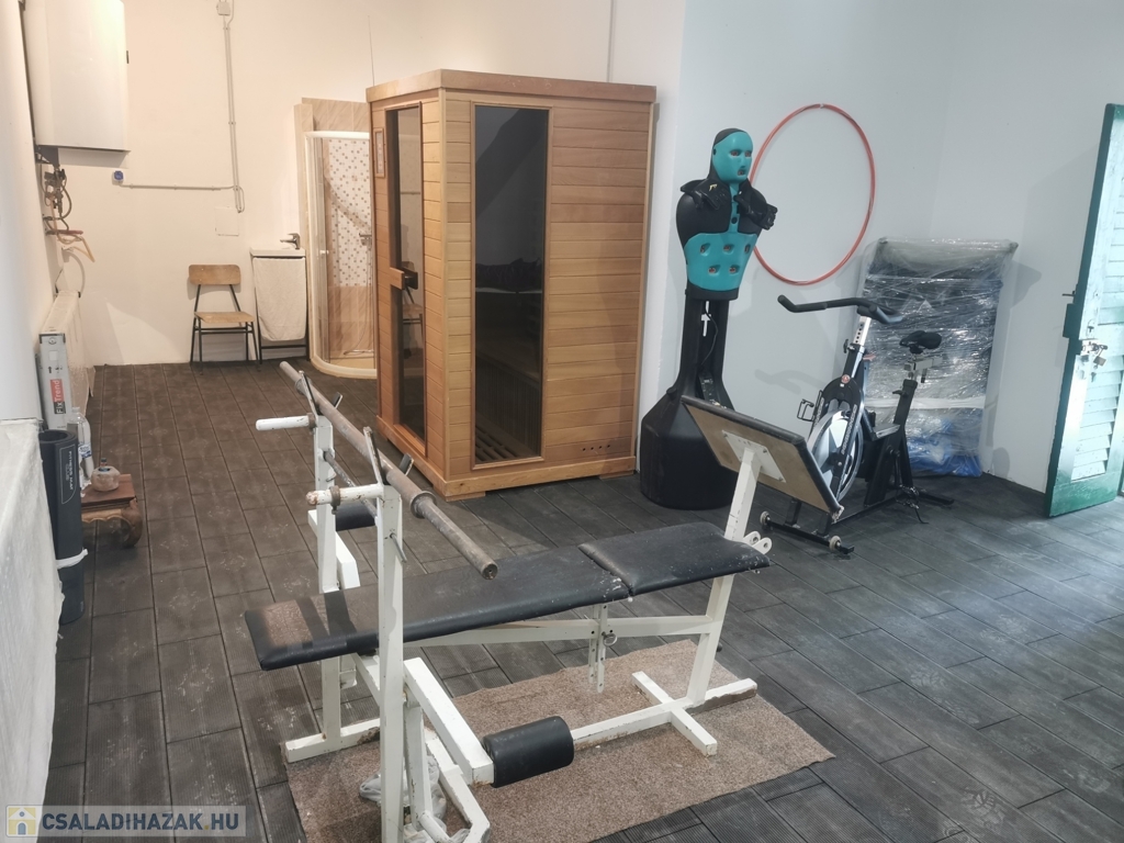Az edzőterem különleges kényelmet biztosít: 3 személyes infra szauna, zuhanyzó is helyet kapott benne. A helyiség könnyedén egybenyitható a lakótérrel, így akár egy tágas plusz szobává alakítható, de igény szerint külön lakrésszé is átalakítható.
