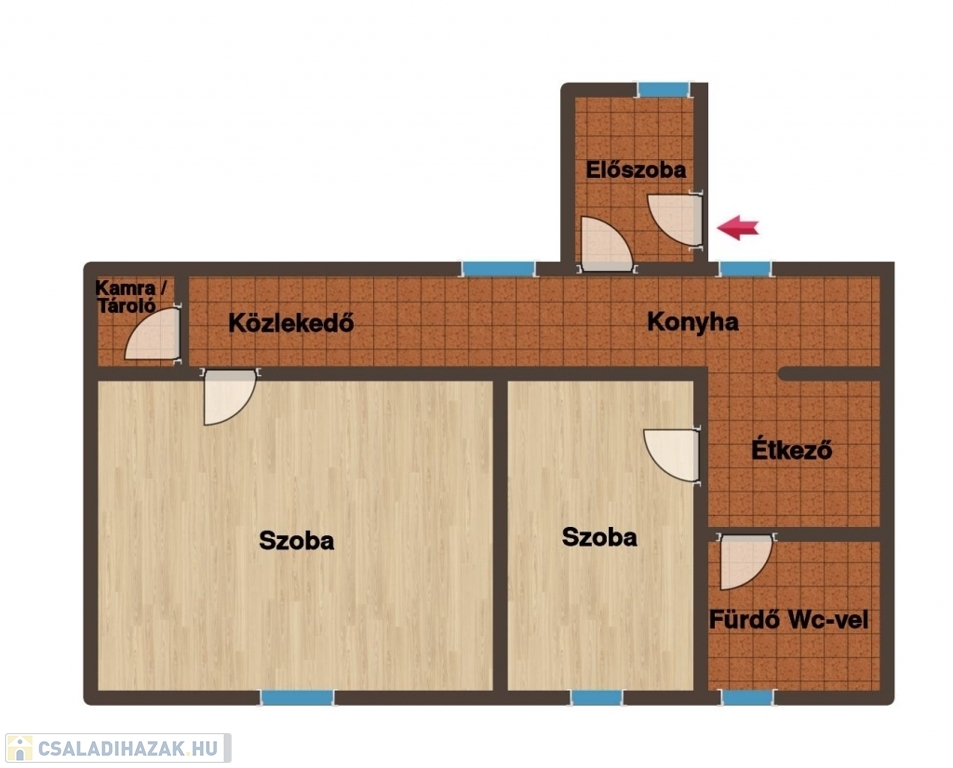 Az ingatlan 65 négyzetméteres lakóterében kialakításra került 2 szoba, előszoba, konyha, étkező, fürdőszoba, és tároló (régebben kazánház volt).