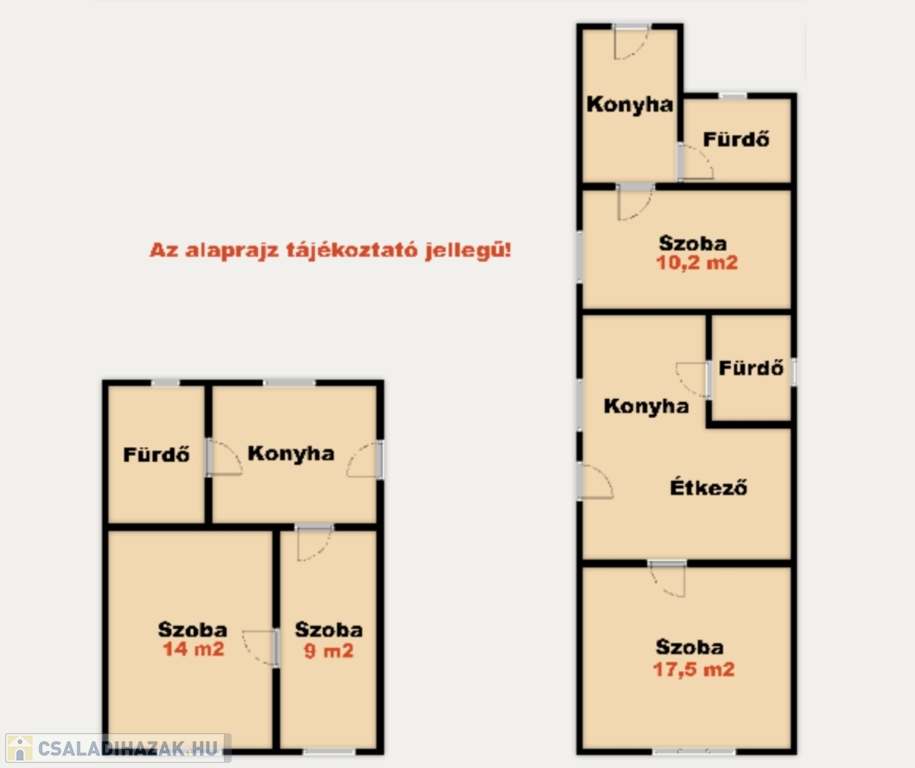 • Első lakrész (40 m²): Két szoba, konyha, fürdő.