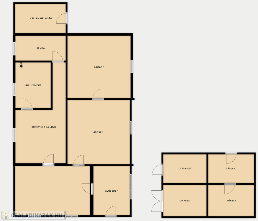 A fő épület két hálószobából, egy nappaliból, egy ebédlőből, konyha (+kamra) részből valamint egy fürdőszobából áll.