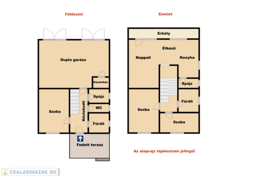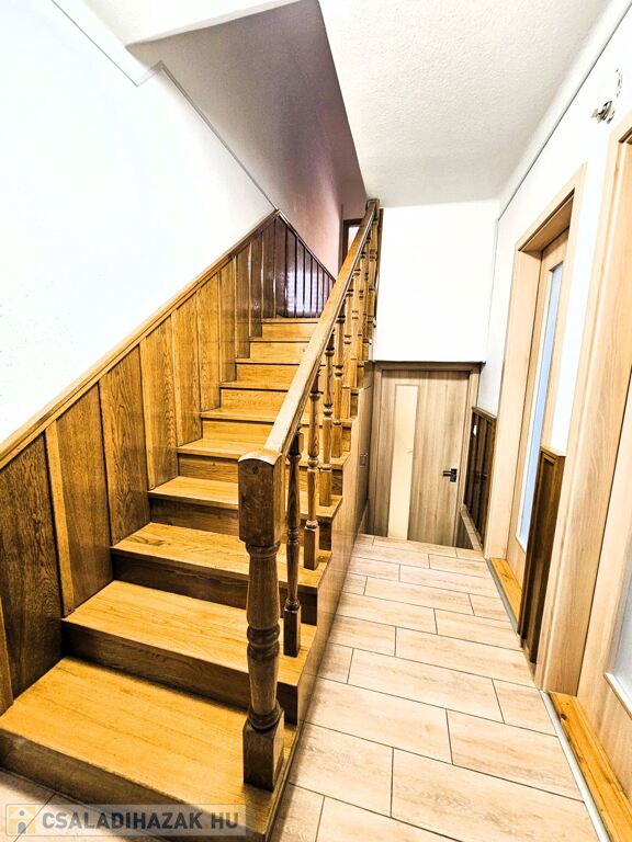 - Földszinten kialakításra kerület: szoba, közlekedő, fürdőkádas fürdő, külön WC, kazánház, dupla garázs, spájz, amely alatt pince található és 12 m2-es fedett terasz.