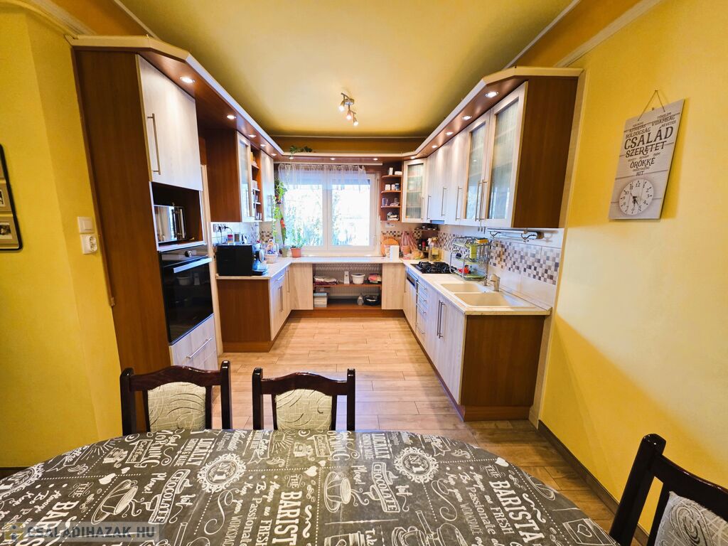 Kiskunhalas kertvárosi részén, csendes utcában kínáljuk ezt a 130 m² lakóterületű, kiváló állapotú, nappali + 3 szobás sorházat 199 m²-es telken. Masszív 1984-es építésű otthon beton alapra, tégla falazattal és cseréptetővel. Külső homlokzat szigetelt, nemesvakolattal színezett. Műanyag szigetelt ablakok redőnnyel és szúnyoghálóval felszerelve. Fűtés gázkazánnal + radiátorokkal, melegvíz villanybojlerről vagy gázkazánról. Alacsony rezsi a 6 kW-os napelemrendszernek köszönhetően!