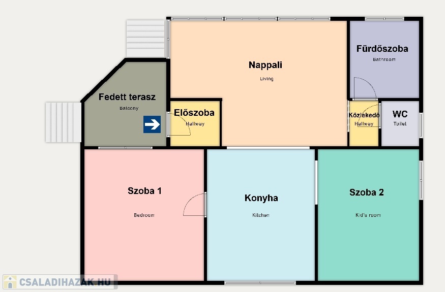 Az ingatlanban kialakításra került egy amerikai konyhás nappali, 2 szoba, fürdőszoba káddal, WC, valamint a bejárat előtt egy 7 m2-es fedett terasz.