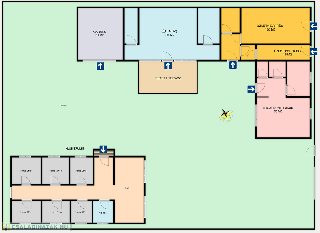 egy utcafronti lakás 70 m2, - egy vadonatúj belső udvari lakás 80 m2, - garázs 30 m2 és egy külön álló 8 helyiségből álló - 160 m2-es klub épület.