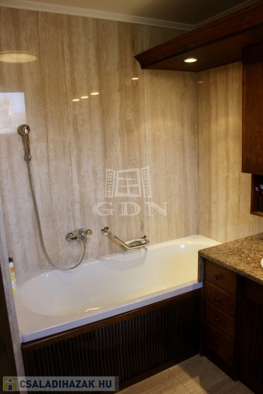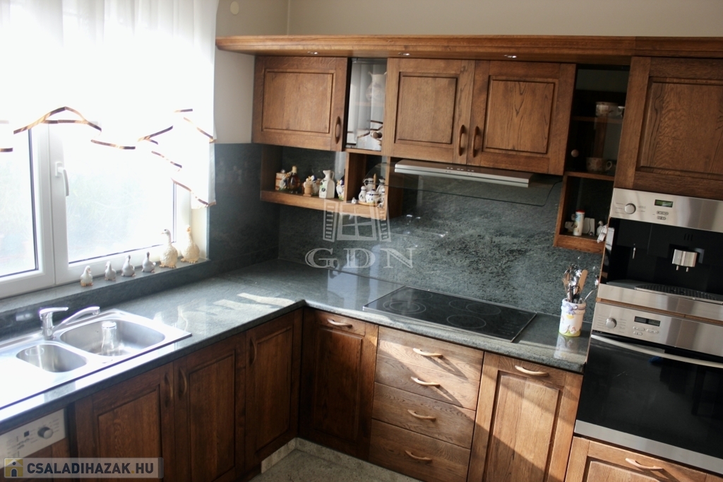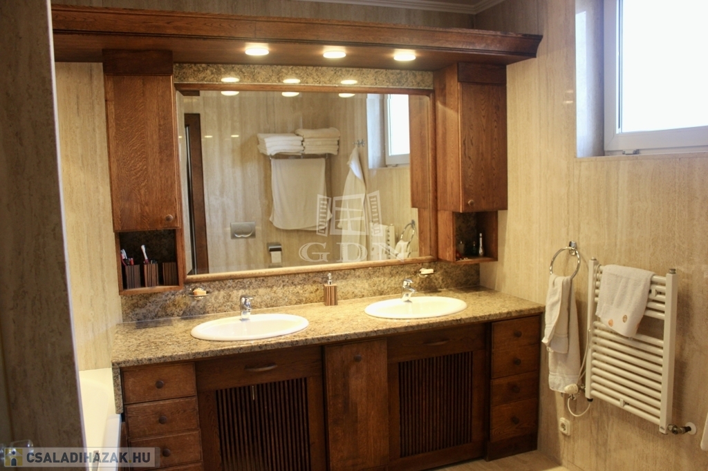 A ház belső tereit magas minőségű anyagok és megbízható műszaki megoldások jellemzik: a fürdőszobákban Laufen szaniterek, a közlekedőkben és vizes helyiségekben gránit burkolatok, míg a szobákban parketta és laminált padló található. A tölgyfából készült beltéri ajtók, a konyhabútor, a lépcső és a beépített gardróbszekrények egyedi kivitelezésűek. A földszinti nappaliban beépített kandalló és stílusos bárszekrény pedig tovább erősíti az otthon meleg, elegáns hangulatát.