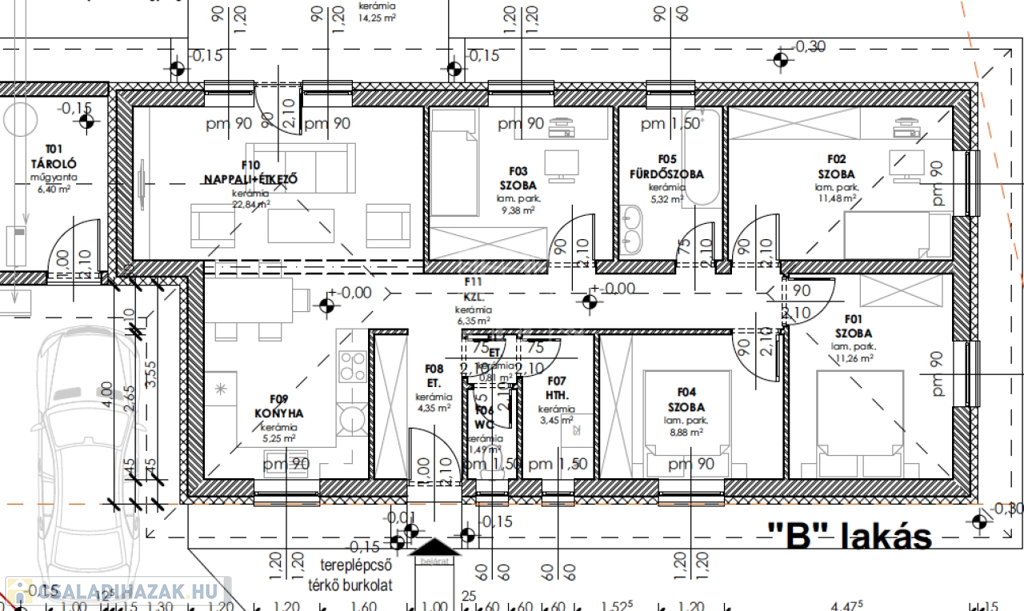 A két ikerházfél egymás tükörképe, az egyetlen különbség, hogy a B házhoz nagyobb telek tartozik.
