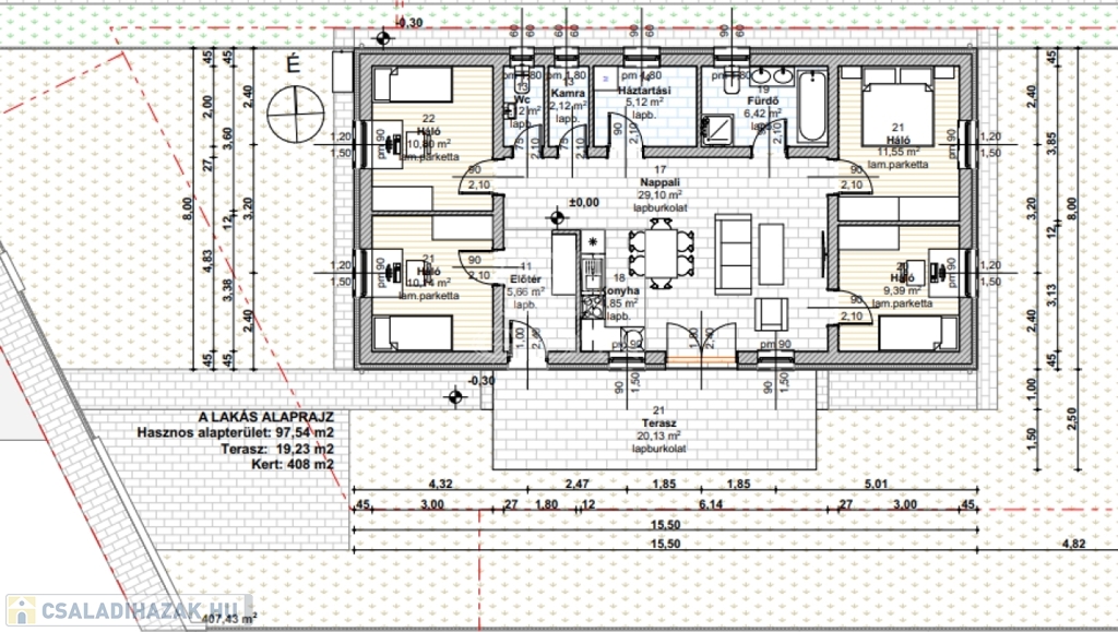 Az otthon nettó 97,54 négyzetméteres, ehhez + terasz 19,23 m2 kapcsolódik.