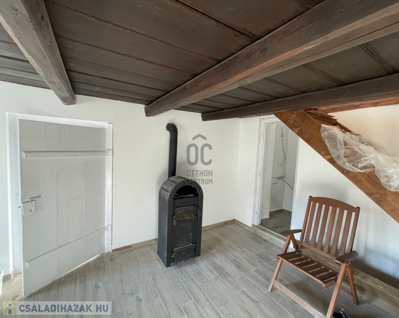 Az alsó szinten egy előszoba, konyha, fürdő, nappali található, itt megmaradt az autentikus fafődém.