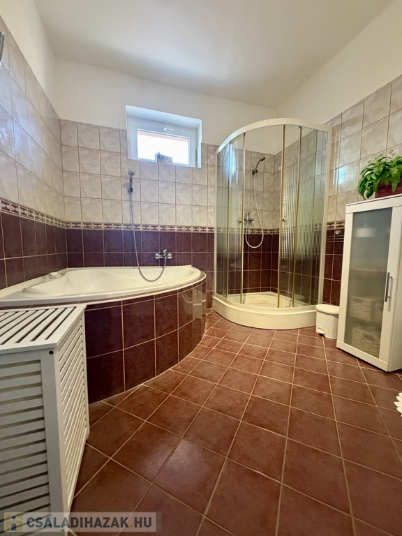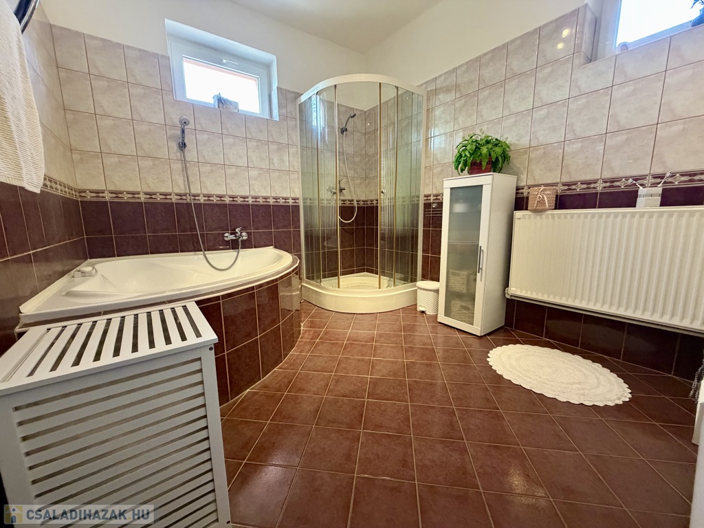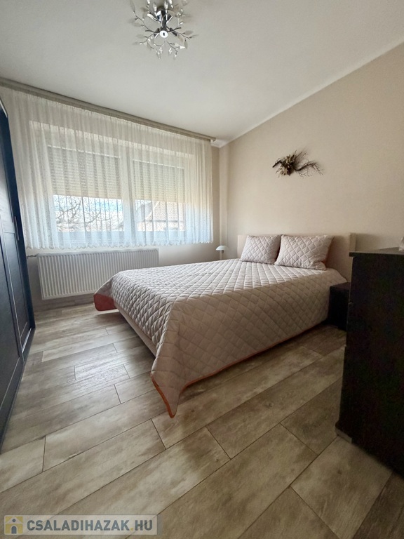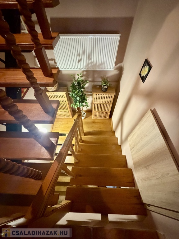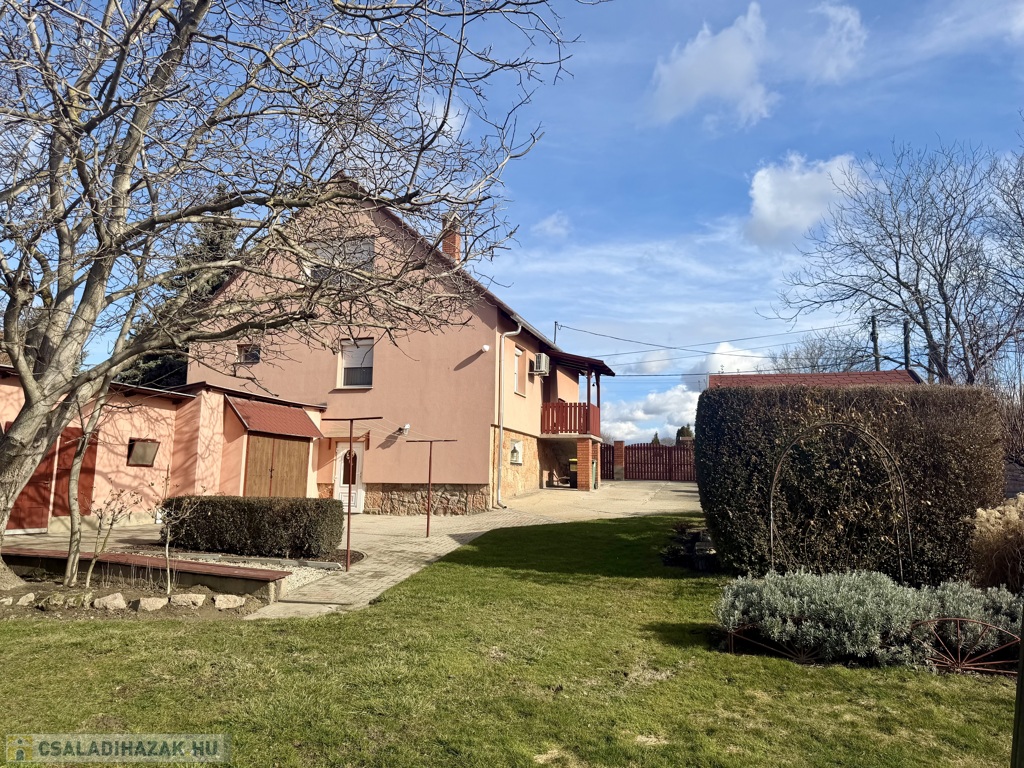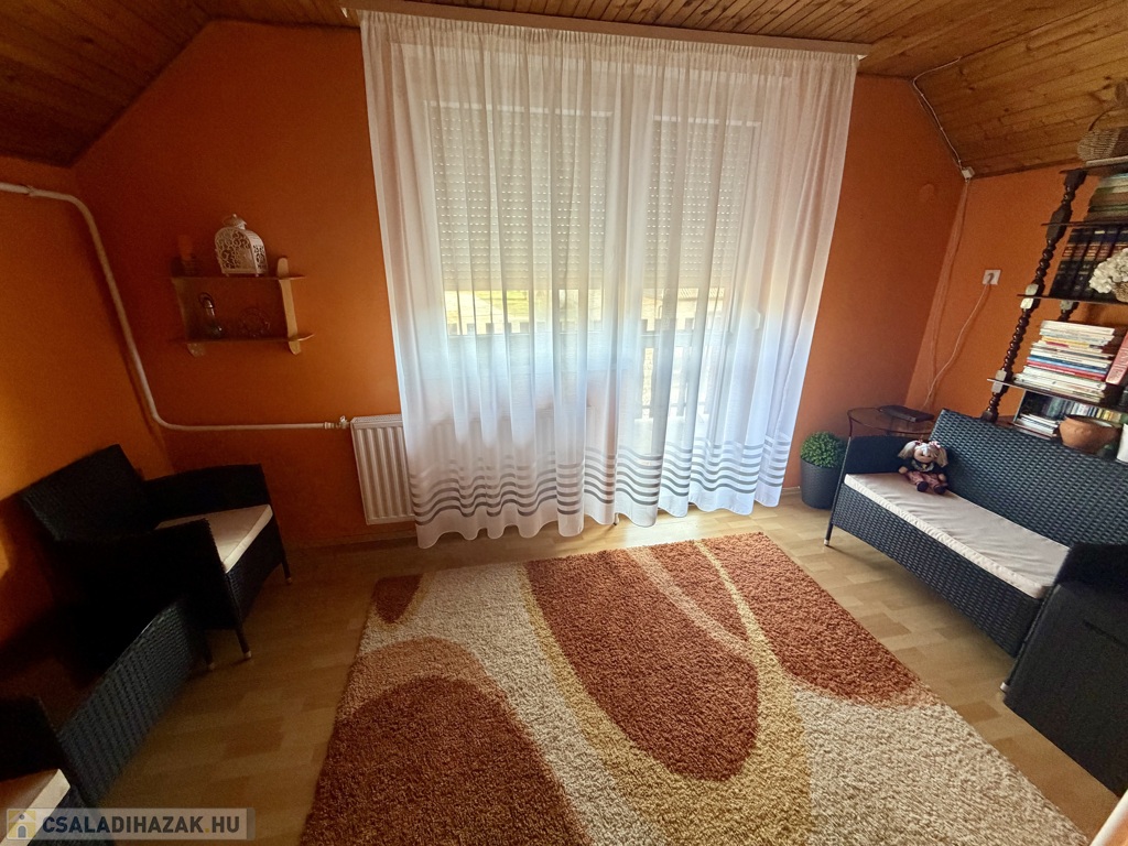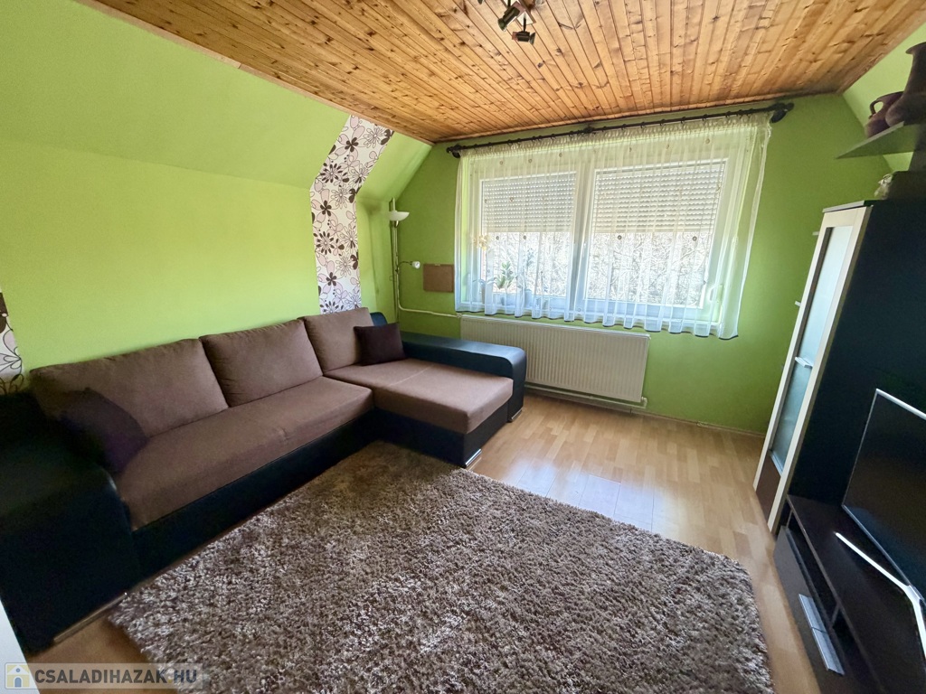 Az 1990-ben épült, szigetelt téglaház szintenként 75 m²-es kialakítással épült, a beépített tetőtérrel együtt összesen nettó 185 m² életteret kínál. A térszervezés kifejezetten jól működik nagyobb család esetén is.