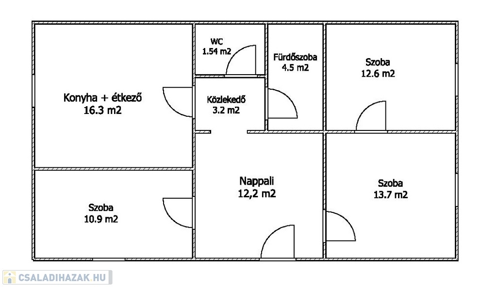 Kellemes, élhető elosztású. Nappali + 3 szoba lett kialakítva. WC és fürdőszoba külön helyiségben található.