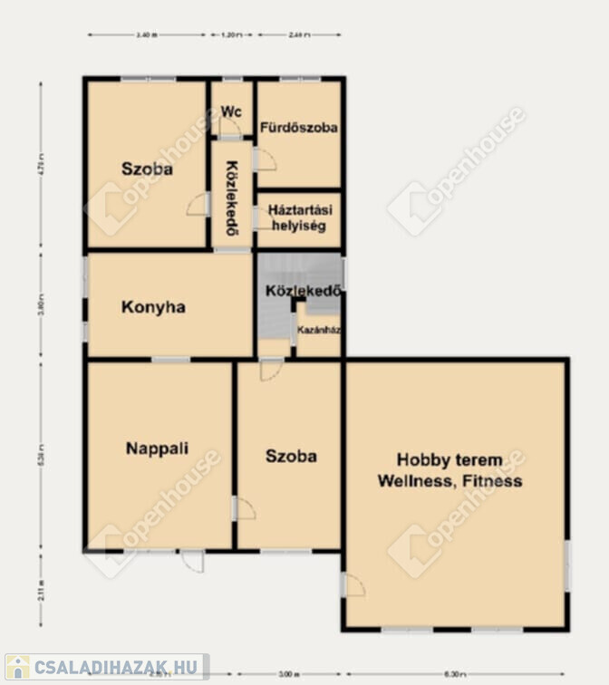 Alagsor: Második nappali-étkező helyiség, két különnyíló hálószoba, további konyha, fürdőszoba + külön WC, háztartási helyiség + kazánház, tágas hobbitér (alkalmas lehet műhelynek, edzőteremnek, irodának vagy wellness részlegnek).