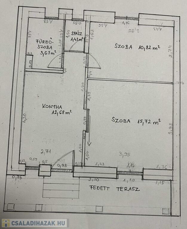 - 2 szoba / 15,7nm, 10,82nm / konyha 12,68 nm, fürdőszoba 3,63 nm, kamra 1,43 nm..