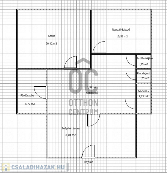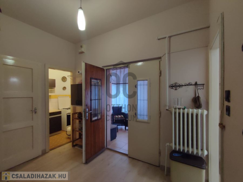Az ingatlanban a beépített teraszon kívül két külön nyíló szoba található, főzőfülke, közlekedő, fürdőszoba, padlásfeljáró és pincelejeráró.