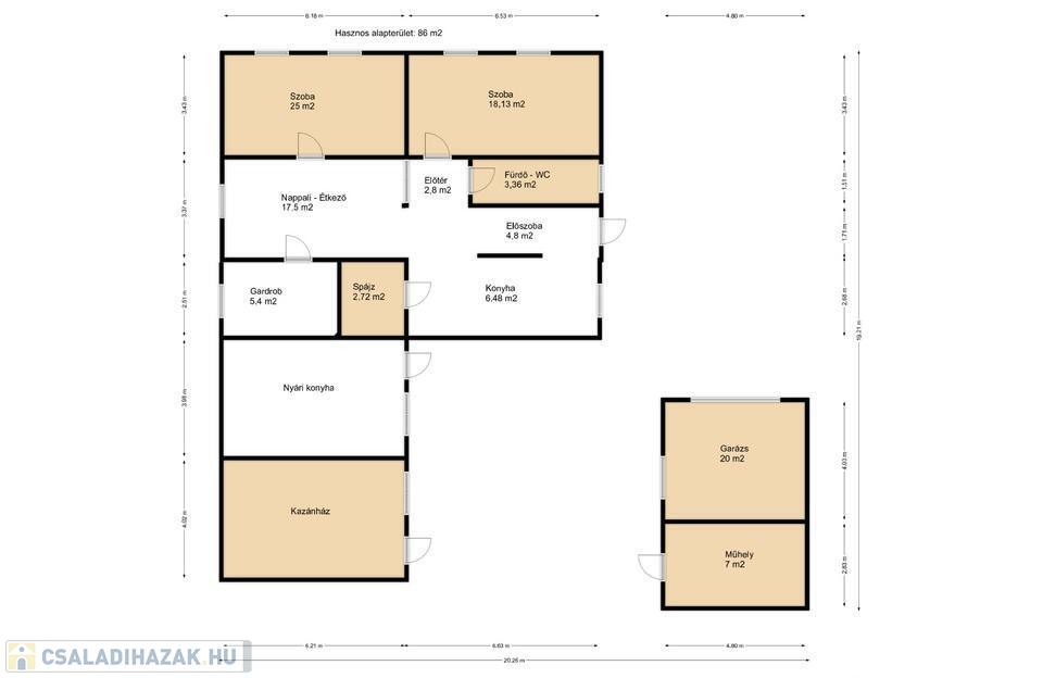 A lakóház folytatásában található a nyári konyha, kazánház, garázs és műhely.