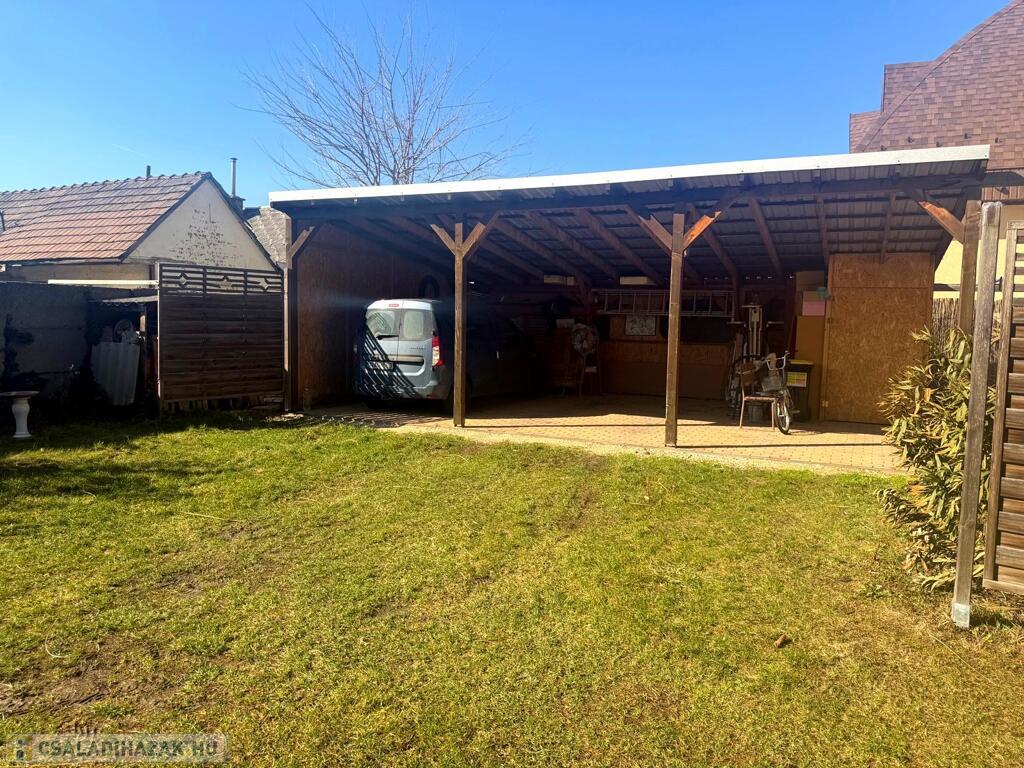 A 445 m²-es telek élhető méretű, könnyen karbantartható, rendezett és körbekerített. Egy kétállásos fedett kocsibeálló és egy kerti tároló tovább növeli a praktikumot, a részben térkövezett beálló pedig kényelmes parkolást biztosít.
