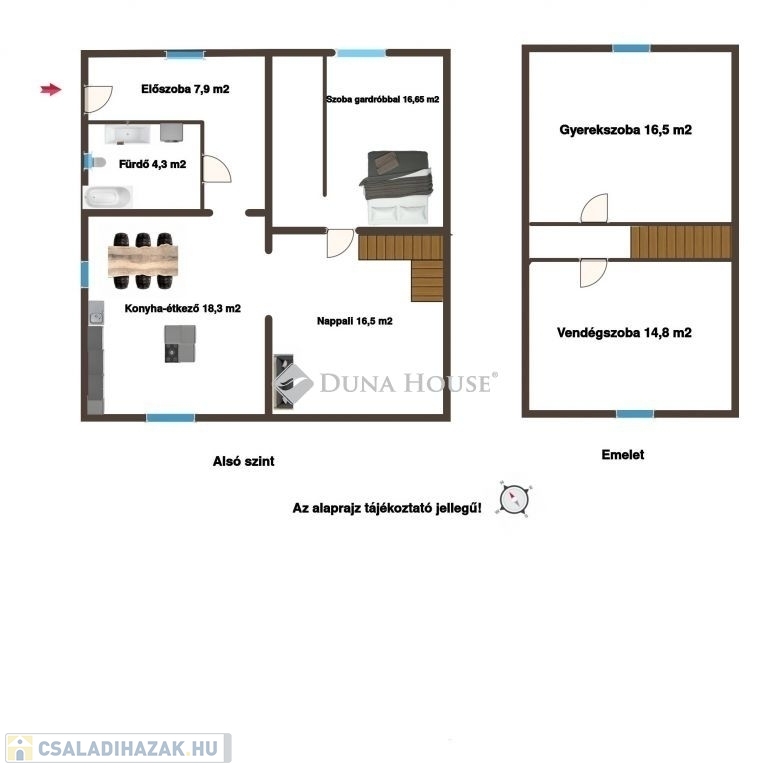 Földszint: előszoba, konyha, étkező, gardrób, hálószoba, nappali