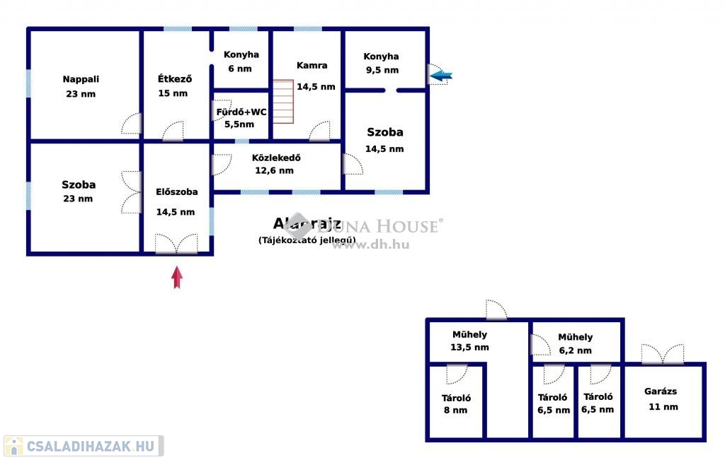 - konyha, kamra (6 és 14,5 nm)
