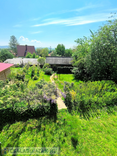 A kert rendezett, telis-tele virágokkal, dísznövényekkel, gyümölcsfákkal és a kert végében egy tároló helyisggel.