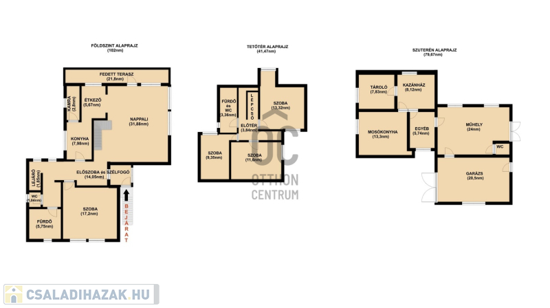 A tetőtérben három hálószoba és egy fürdőszoba+WC található.