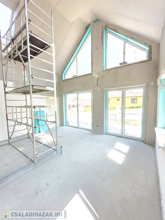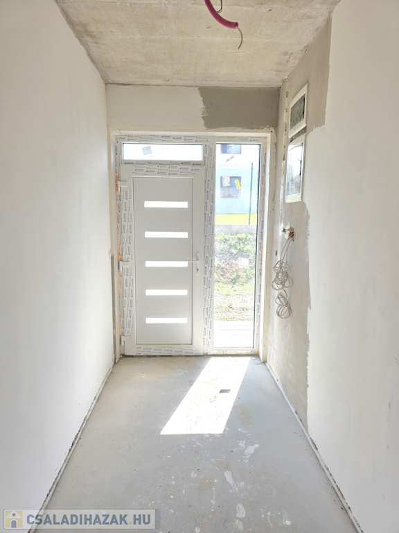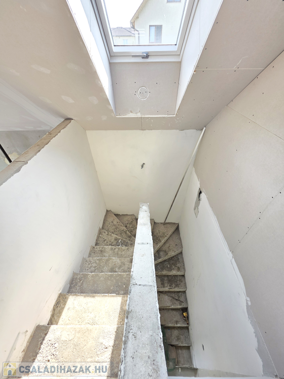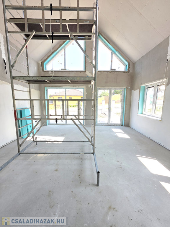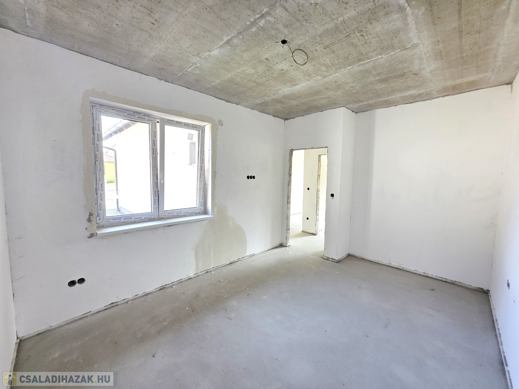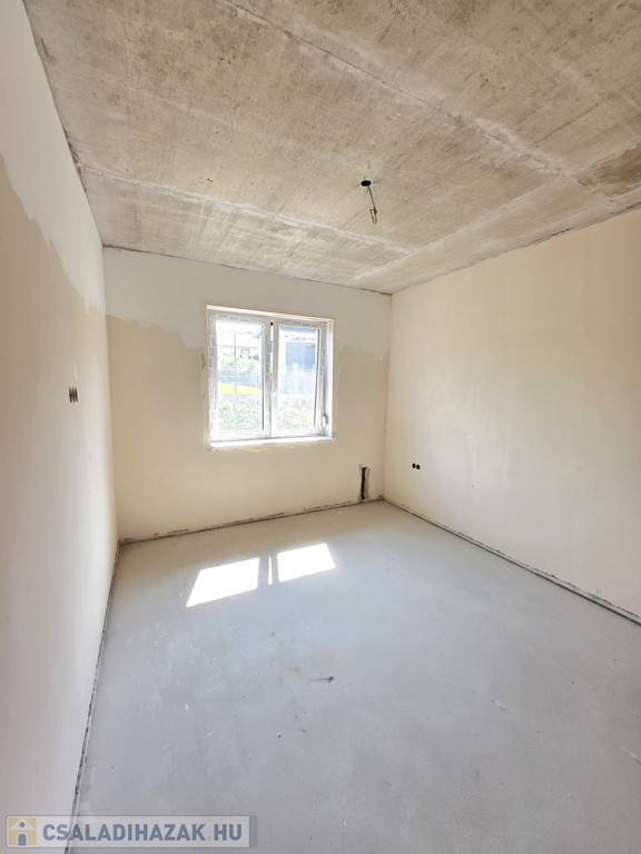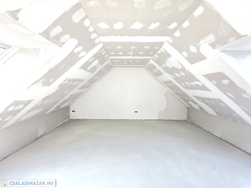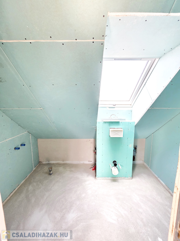 Az emeleten pedig egy nagyszoba és fürdőszoba található. A ház minden helyisége világos, napfényes. Az ingatlan falazata 44-es xtherm rapid okostégla hőszigetelő vakolattal. A nyílászárók 3 rétegű ablakok, elektromos redőnnyel és szúnyoghálóval ellátva.