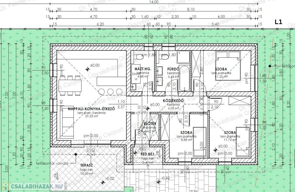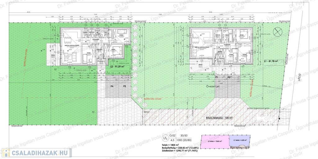L1 (első, utcafronti ház) 81,78 nm lakótér + 15,42 nm terasz, bruttó 96,78 nm, lásd a képek között.