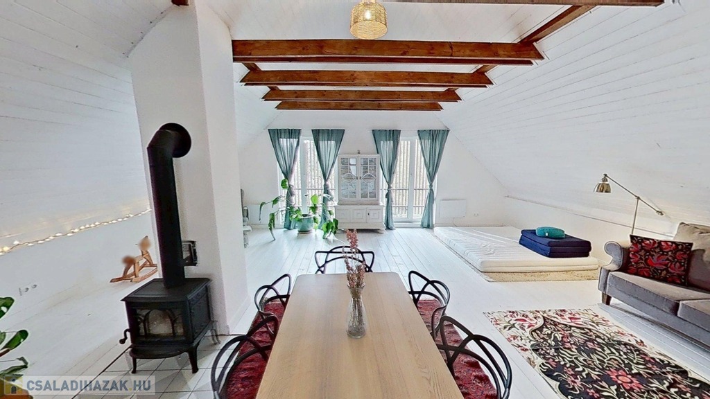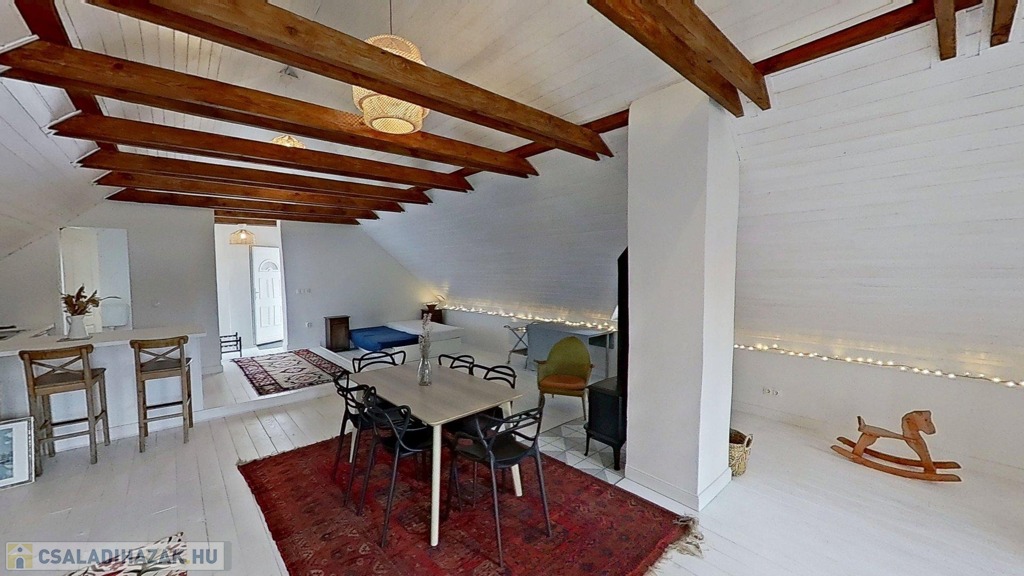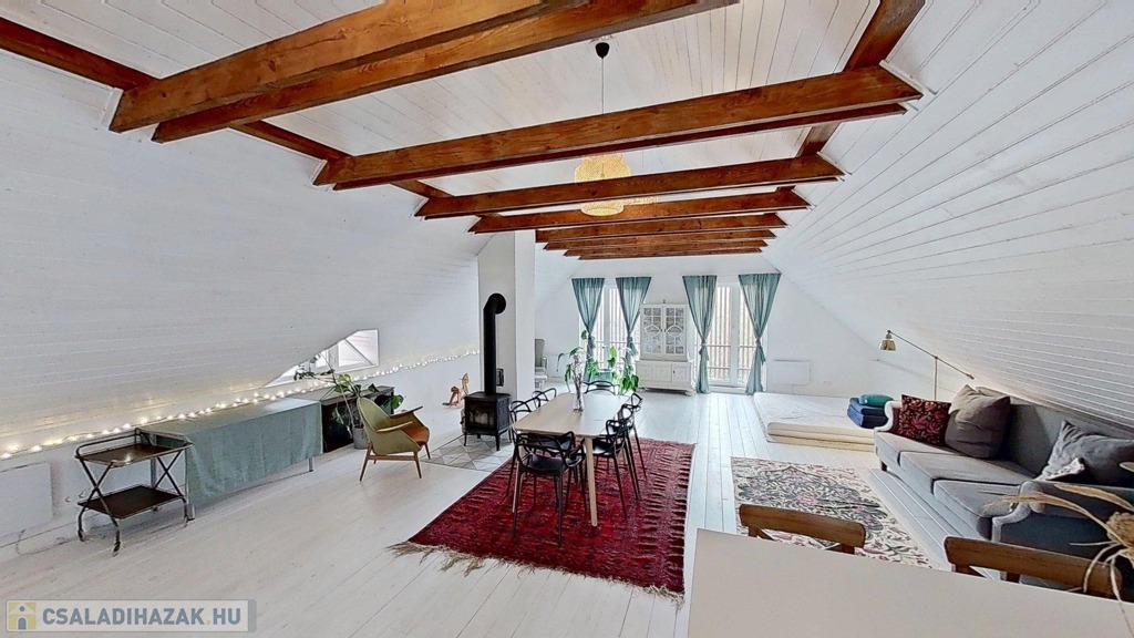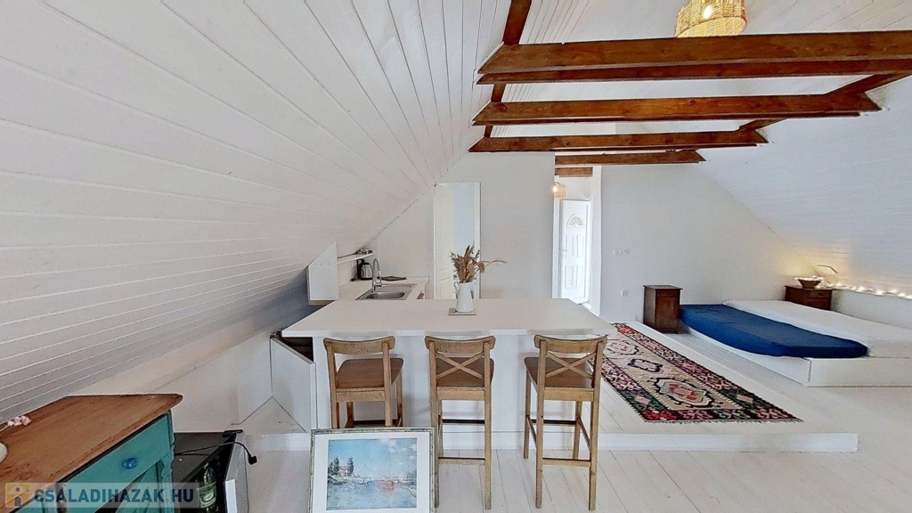 Az emeleti lakótér külső lépcsőn, az udvaron keresztül közelíthető meg, összesen 60 m2 alapterületű, egy légtér, köszönhetően a 4 m-es belmagasságnak. Itt egy szigetes konyha és egy zuhanyzós fürdőszoba került kialakításra. 2024-ben építette be a tulajdonos a tetőteret, falazata Porotherm tégla, 10 cm-es külső szigeteléssel. Az épület betonfödémes, a felújítás alkalmával teljes hájazatcserén esett át, fedése hódfarkú cserép. Fűtéséről Jotul norvég kandalló, klíma és pár fali panel gondoskodik, melegvízellátásáról pedig egy 100 literes villanybojler.