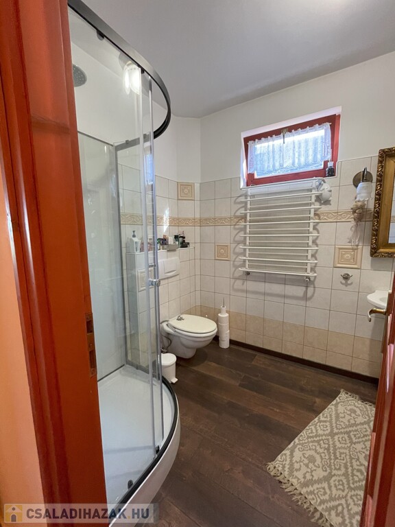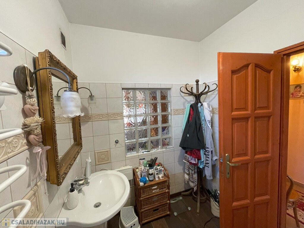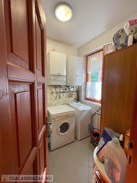 Leányfalu egyik csendes, központhoz közeli utcájában eladó egy 2005-ös építésű, 2 független bejárattal rendelkező lakást magában foglaló családi ház: a kertkapcsolatos garzon az úszómedence szintjén a kertre néz, míg a garázs szintjén van a ház bejárata. Belső 2 szintes, rendkívül világos, napsütötte a ház. A tágas garázsban 1 autó fér el. Innen közvetlenül is bejuthatunk az előszobába. A földszinten mosókonyha, bejárható gardróbszoba, tágas fürdőszoba található, és az amerikai konyhás nappali előtt, az előszobából egy vendéglakrész nyílik még, saját fürdőszobával. A nappali keleti fekvésű, 27 nm-es fedett teraszán egy étkező- és egy ülőgarnitúra is kényelmesen elfér. A nappaliból megközelíthető felső szinten 3 tágas hálószoba és egy óriási fürdőszoba található, masszázskáddal és zuhanykabinnal, bidével. Az egyik hálószobából itt is egy hatalmas, nyugati fekvésű, fedett terasz teszi kellemessé a délutáni pihenést. A ház műszakilag folyamatosan karbantartott! Az ablakok jó állapotú fa nyílászárók, szúnyoghálóval ellátottak. Duplán rezsivédett a ház, a 2 önálló bejáratú lakrész miatt! A házban hűtő-fűtő klímák, cserépkályha és gázkazán, valamint a frissen telepített 5 kW-os napelem rendszer gondoskodik a szerény rezsiről. Az úszómedence 35 nm-es, ellenáramoltatós, műszakilag és esztétikailag kifogástalan állapotú, panorámás.