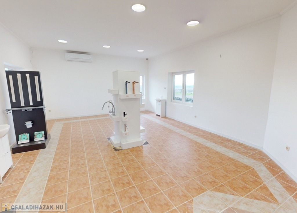 A földszinten találhatunk egy hatalmas nagy teret. Gyönyörű szép burkolattal, fallal, spotlámpákkal. Gyönyörű kilátással a környezetre. Képzeljük el, hogy akár egy étteremként, akár egy bemutató teremként – attól függően, hogy mire kívánjuk használni az ingatlant – kiválóan funkcionálhat a mellette levő külön teremmel, recepcióval, és a hozzá tartozó tárolókkal együtt.
