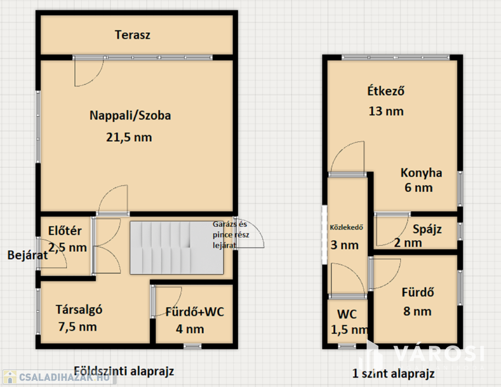 A házhoz tartozik egy 20 nm nagy garázs is, a kazánház (11 nm) a pince szinten van, innen nyílik egy ajtó a nyári konyhára (21 nm), akár műhely vagy bármi más is kialakítható belőle.
