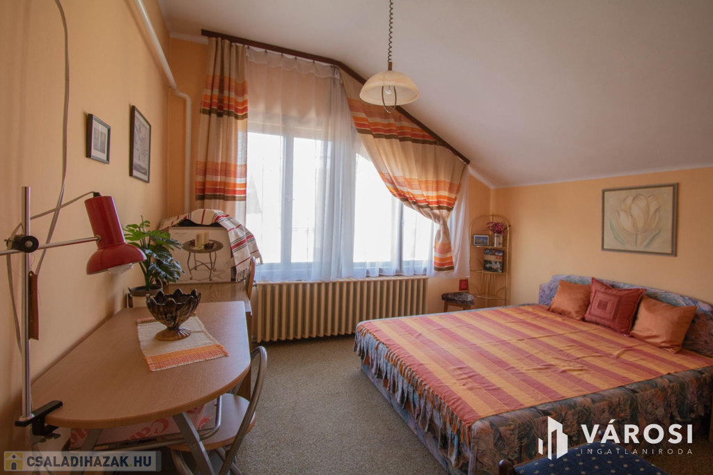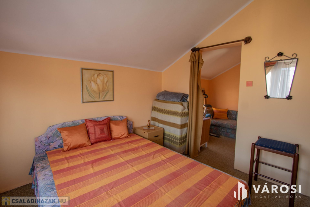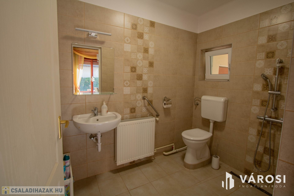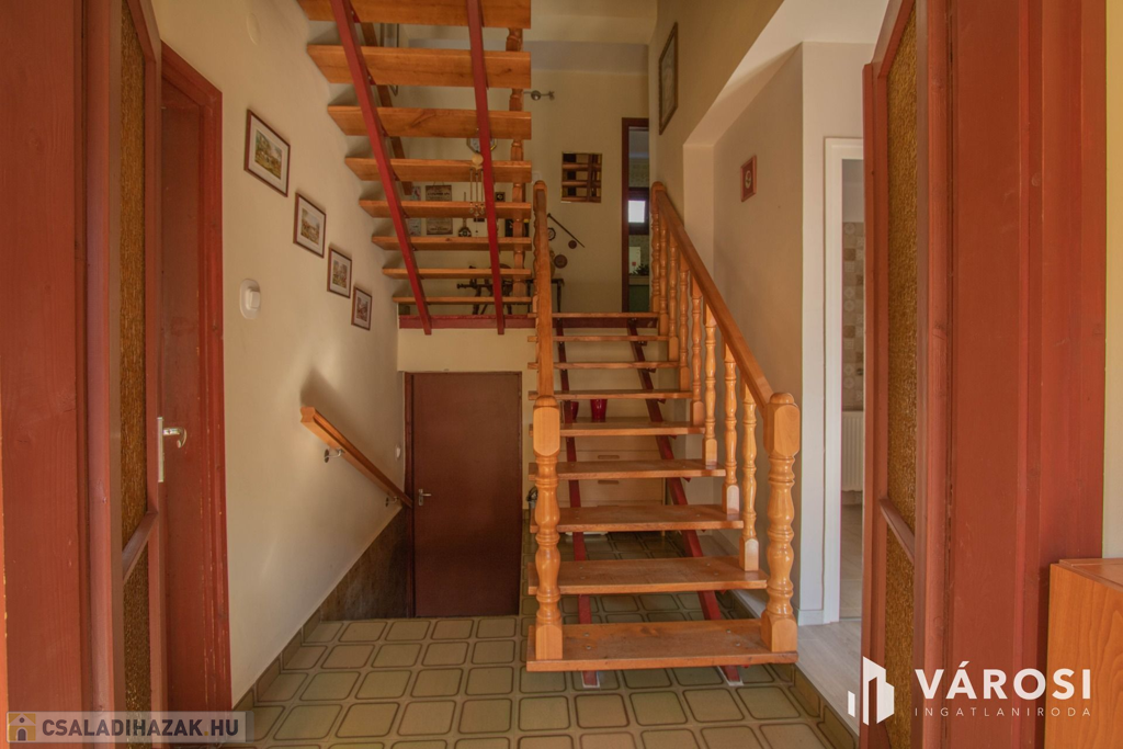 A ház szint eltolással épült, 2 emeletes. A ház földszinti részén egy tágas, világos nappali található, egy kisebb társalgó és egy 3 éve készült fürdőszoba. Azt ezt követő szinten egy étkező, egy konyha, egy kamra, egy nagy fürdő és egy külön WC található. Innen a ház emeleti részére érve 2 szoba lett kialakítva, mindegyik szobához tartozik egy erkély is. Azt ezt követő szinten pedig egy szoba + gardrób és egy jelenleg be nem épített, csak tárolásra használt helyiség van.