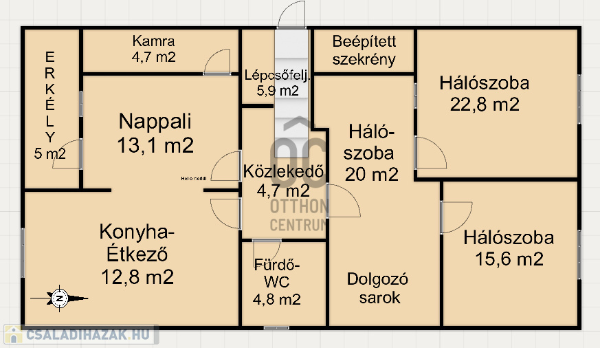 - az emelet 100 m2, melynek helyiségei: 3 hálószoba, 1 nappali, amely erkélykapcsolattal rendelkezik, konyha- étkező, kamra, gardrób, fürdő- WC, közlekedő, lépcsőfeljáró