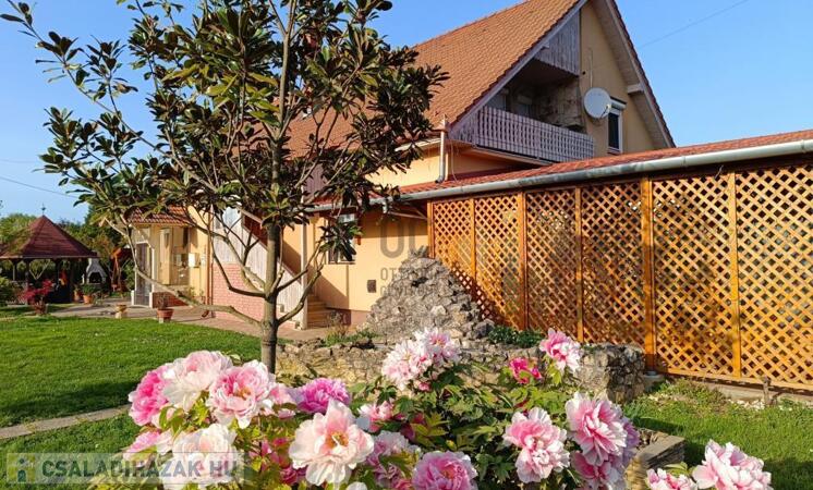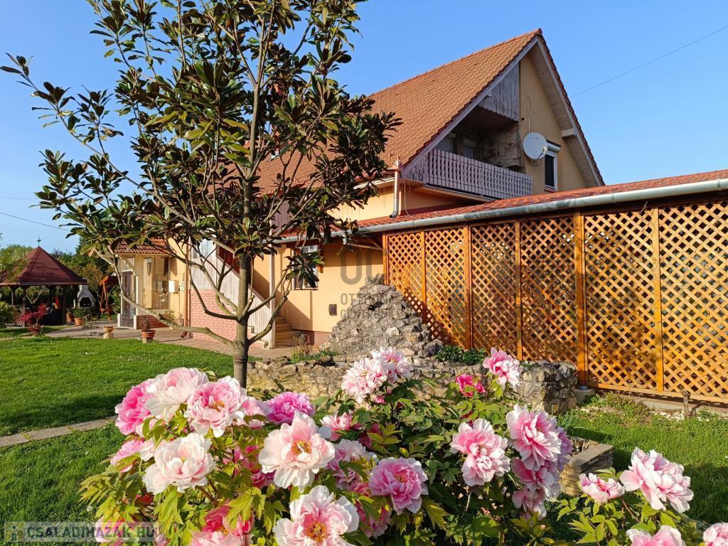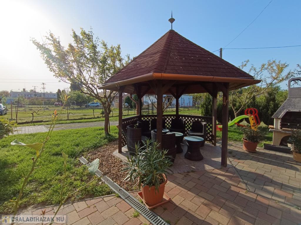 A kertben megépített pergola biztosítja a családi, baráti összejövetelek helyszínét, csodaszép parkosított udvarral, különleges virágzó cserjékkel.