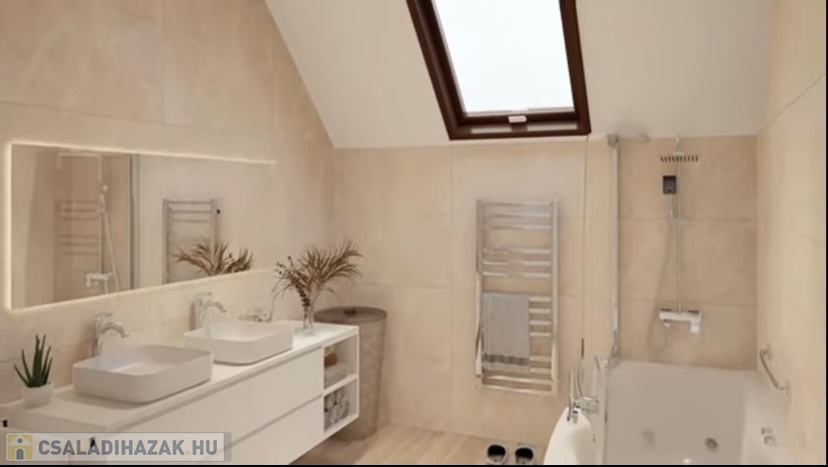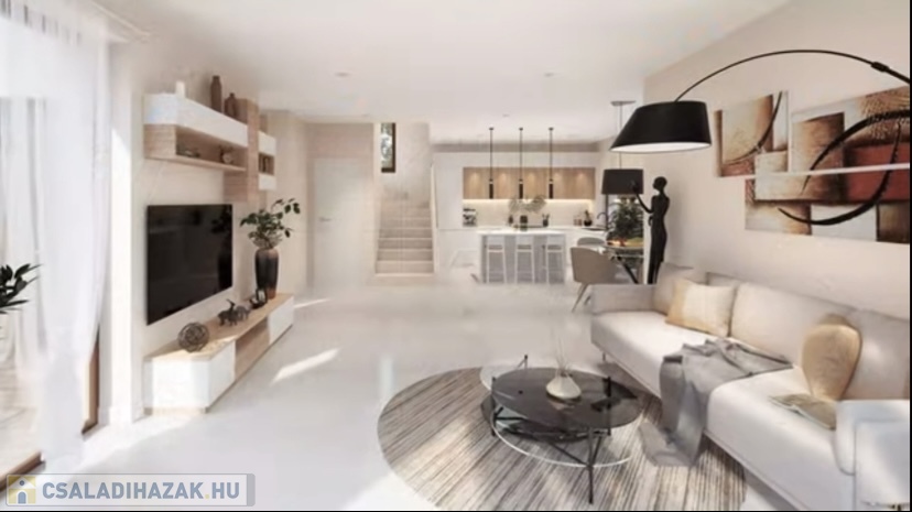Elosztása földszinten: előszoba, nappali+ konyha (40,65nm), kamra, mosókonyha+ gépház, gardróbszoba, szoba, fürdőszoba, terasz.