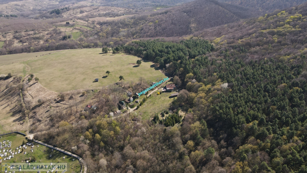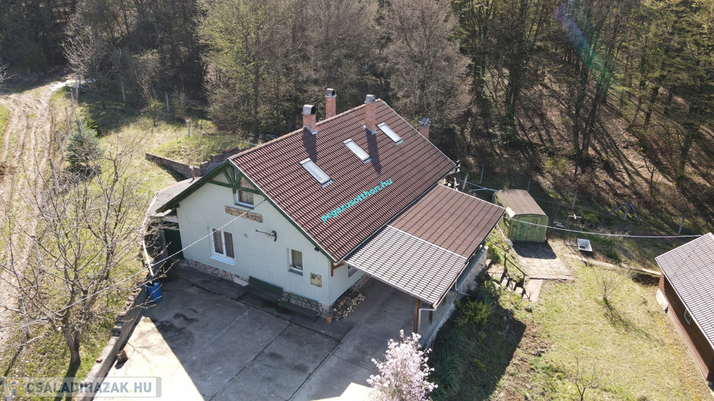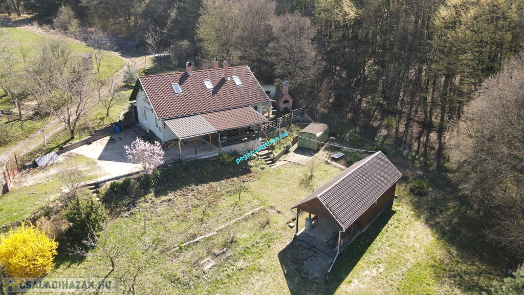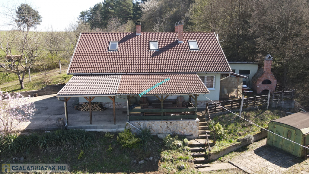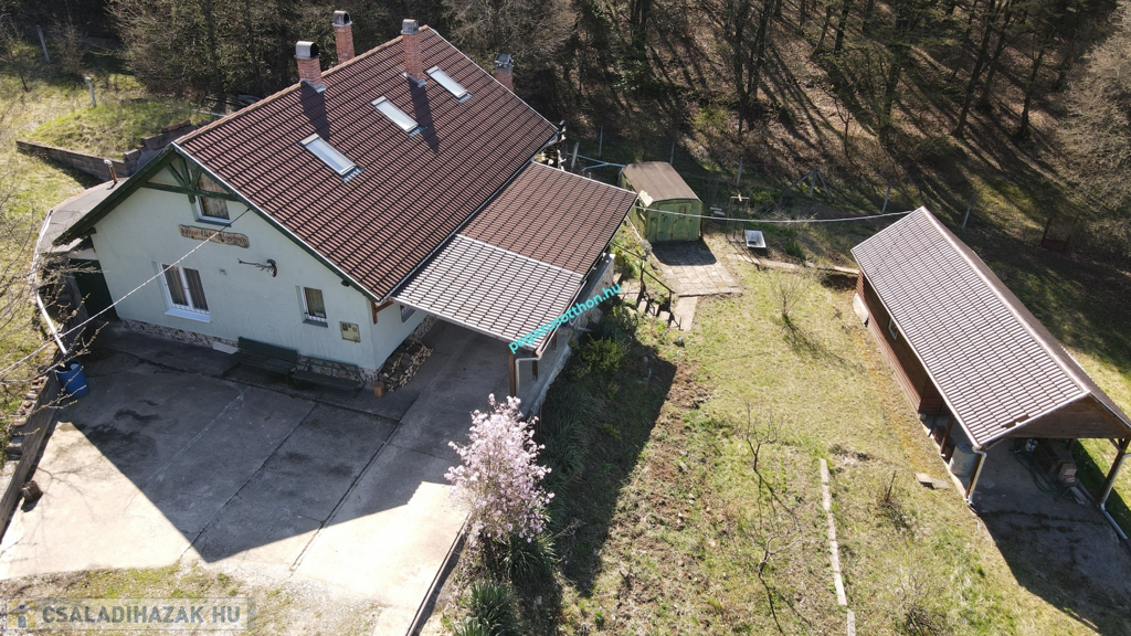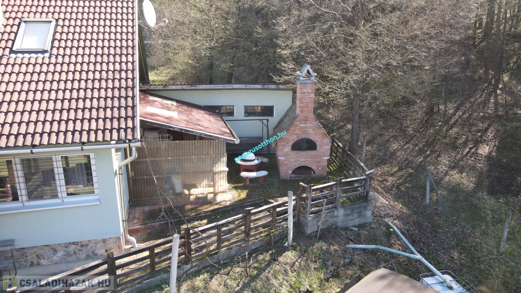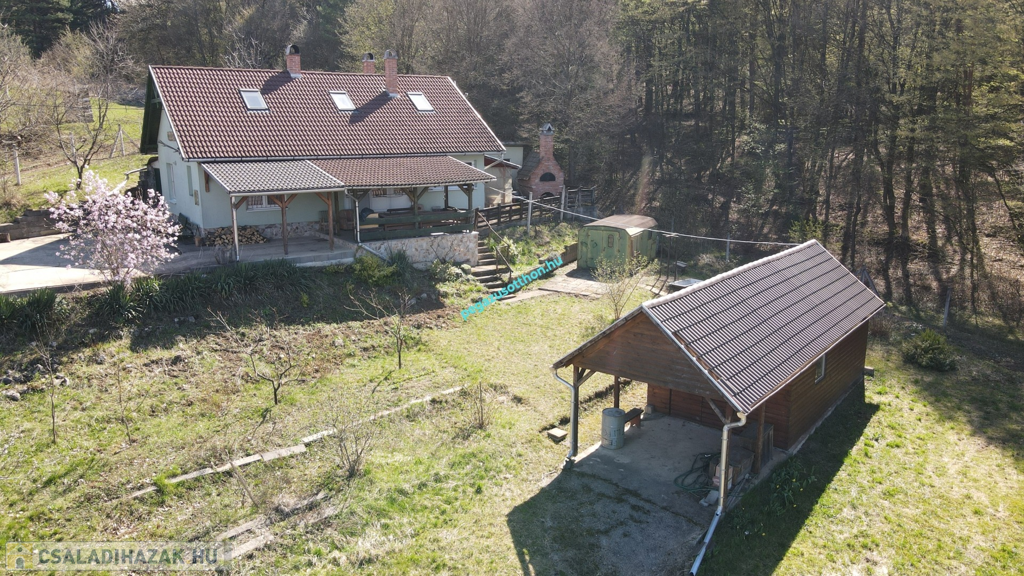 Kiegészítő épületek: A telken található egy 35 m²-es faház, ami kerti kamraként funkcionál, valamint egy fedett terasz/autóbeálló és egy szalonnasütő is. Pince és tárolók: Az épület mögött a hegyoldalba ásott pince található, nagy, fedett és zárt egyéb tároló helyiségekkel. Közművek: Vezetékes víz és villany bevezetve, szennyvízelvezetés derítővel megoldott, valamint fúrt kút is található a telken. Természetközeli környezet: A terület teljesen körbekerített, több kapuval ellátott, és rengeteg fenyő- és gyümölcsfával rendelkezik.
